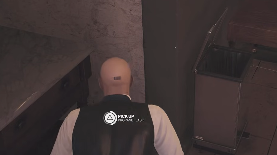 Step 2: Immediately after spawning, use the Kalmer to tranquilize the nearby male NPC, then shoot the maid with a second dart. Both will drop unconscious. Grab the male NPC's disguise and pick up the propane gas canister in the room.