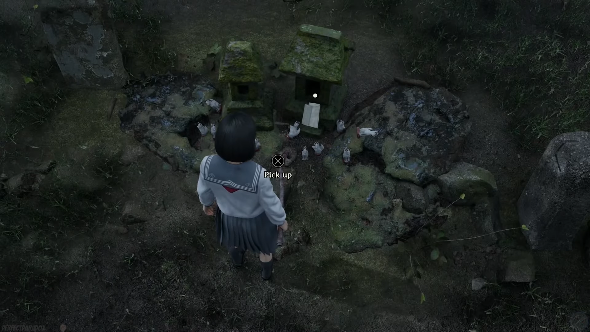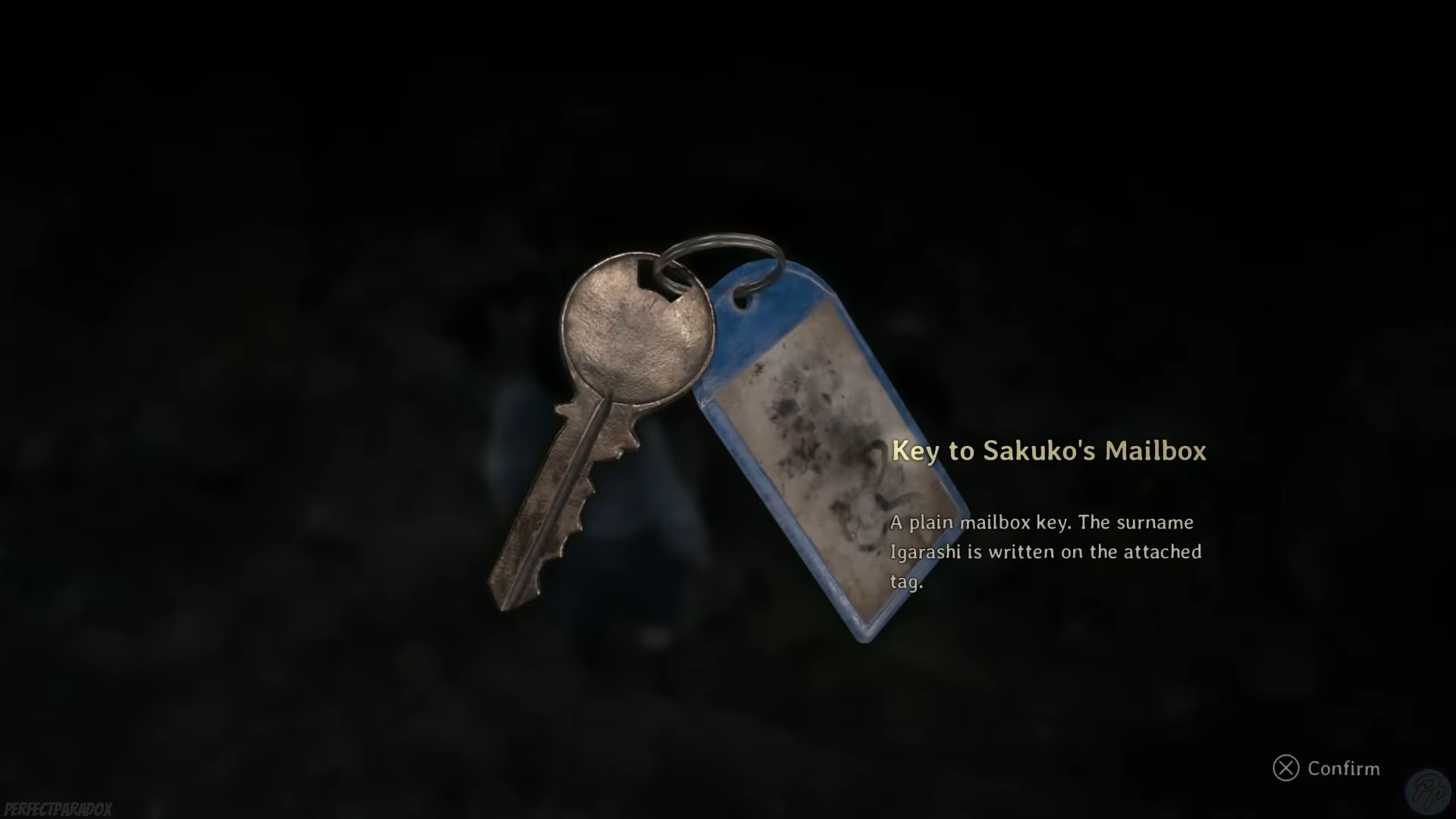 | 2 | Sennensugi Shrine | Pick up the Key to Sakuko’s Mailbox and the Letter from Sakuko’s Mother near rocks/gravestone on the left. | Key acquired. | Tag on the key reads “Igarashi.” Nearby pickups include Arare and an Antique Comb; Divine Water can also be found in the area. |