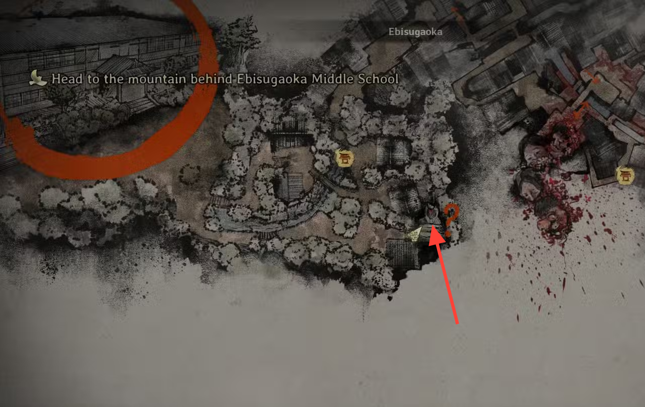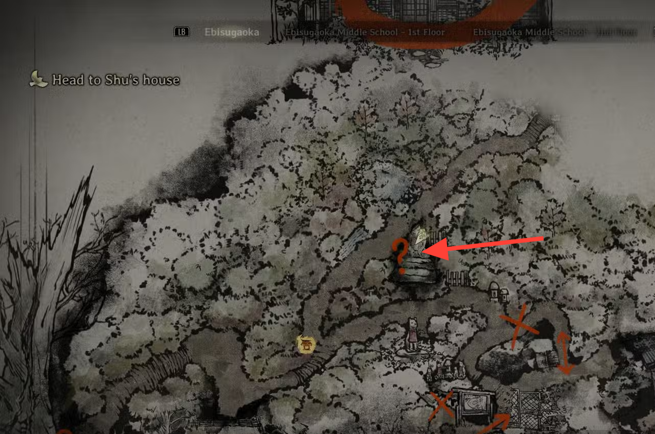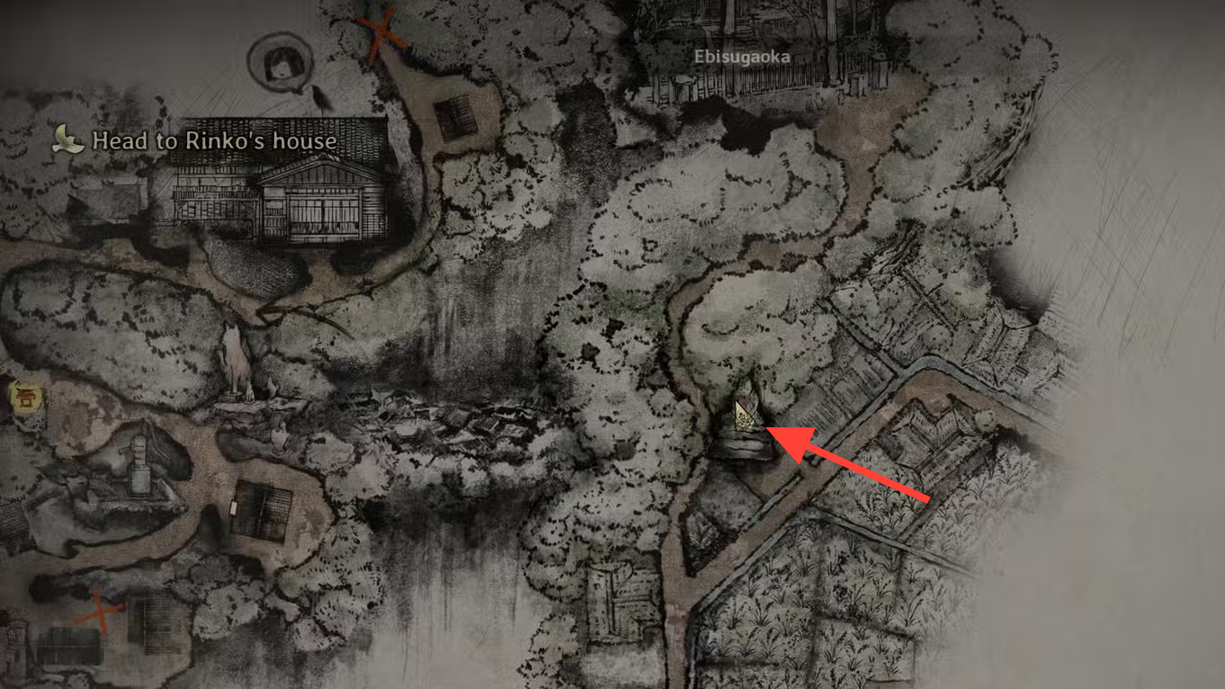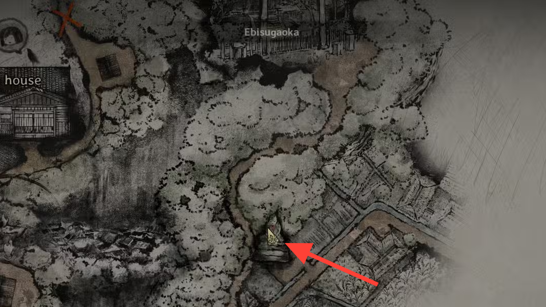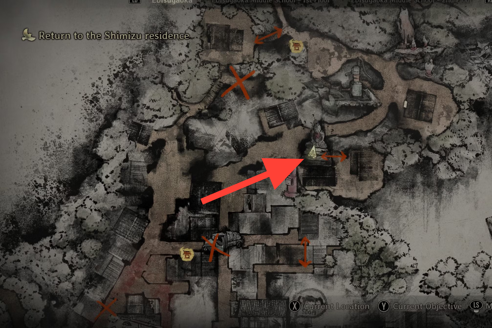 Step 1: Before entering Ebisugaoka Middle School, search the housing cluster southeast of the save shrine. The statue is behind a residence at the south‑east corner.