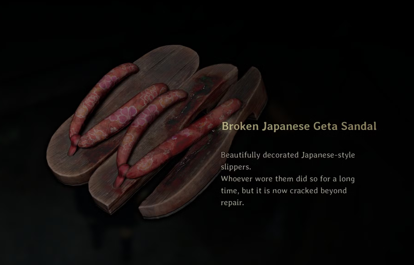 | Wood. | Head to the mountain behind Ebisugaoka Middle School. | Housing cluster southeast of the save shrine, behind a house. | Broken Japanese Geta Sandals. | North side of the damaged bridge by the school. |