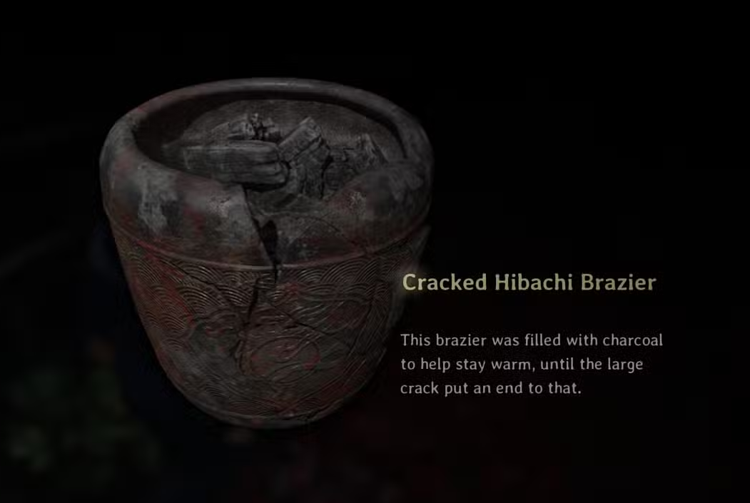 | Fire. | Head to Shu’s house. | Short side path off the main trail, right corner against a closed wooden fence. | Cracked Hibachi Brazier. | Behind Shu’s house beside the shed-like outbuilding. |