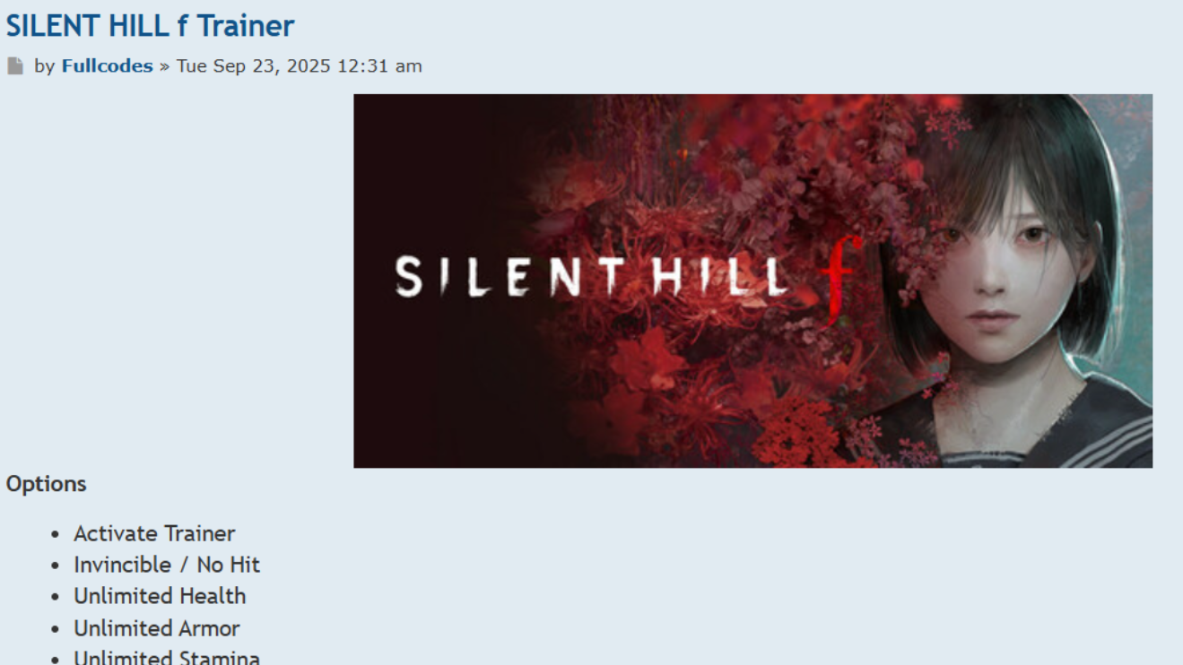 Two community tools are available right now for Silent Hill f on PC: a full-featured trainer posted to FearLess Cheat Engine’s Trainers section, and a standalone Cheat Engine table targeting the game’s 1.0 release on Steam, Epic Games Store, and Microsoft Store (Xbox Game Pass). A third trainer from WeMod is listed as “coming soon,” and PLITCH advertises 28 toggles split across free and premium tiers.