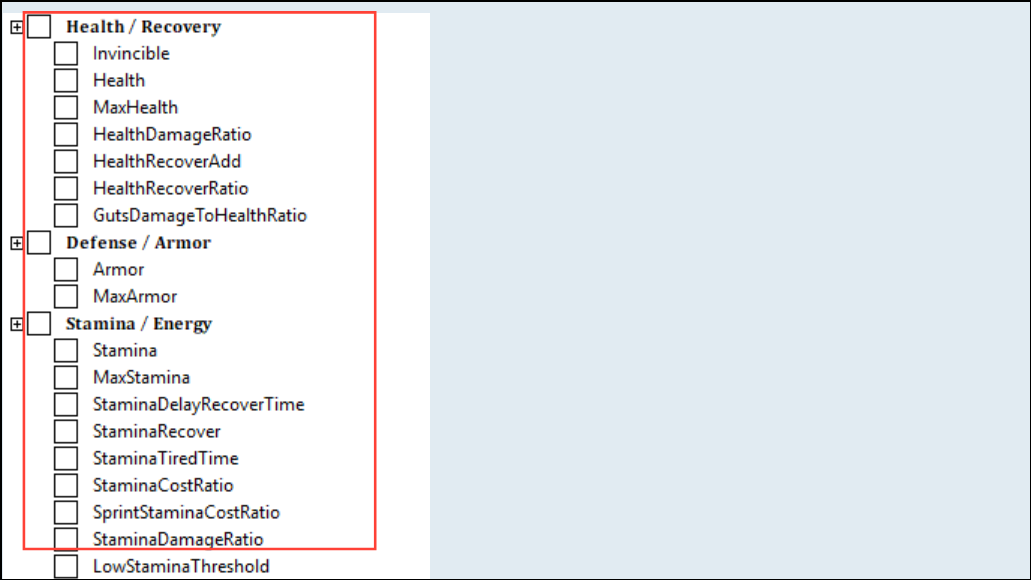 | Stealth/AI | Enemy Can’t See (blind enemies); Enemy Sight Ratio Current Value; Enemy Sight Ratio Base Value |