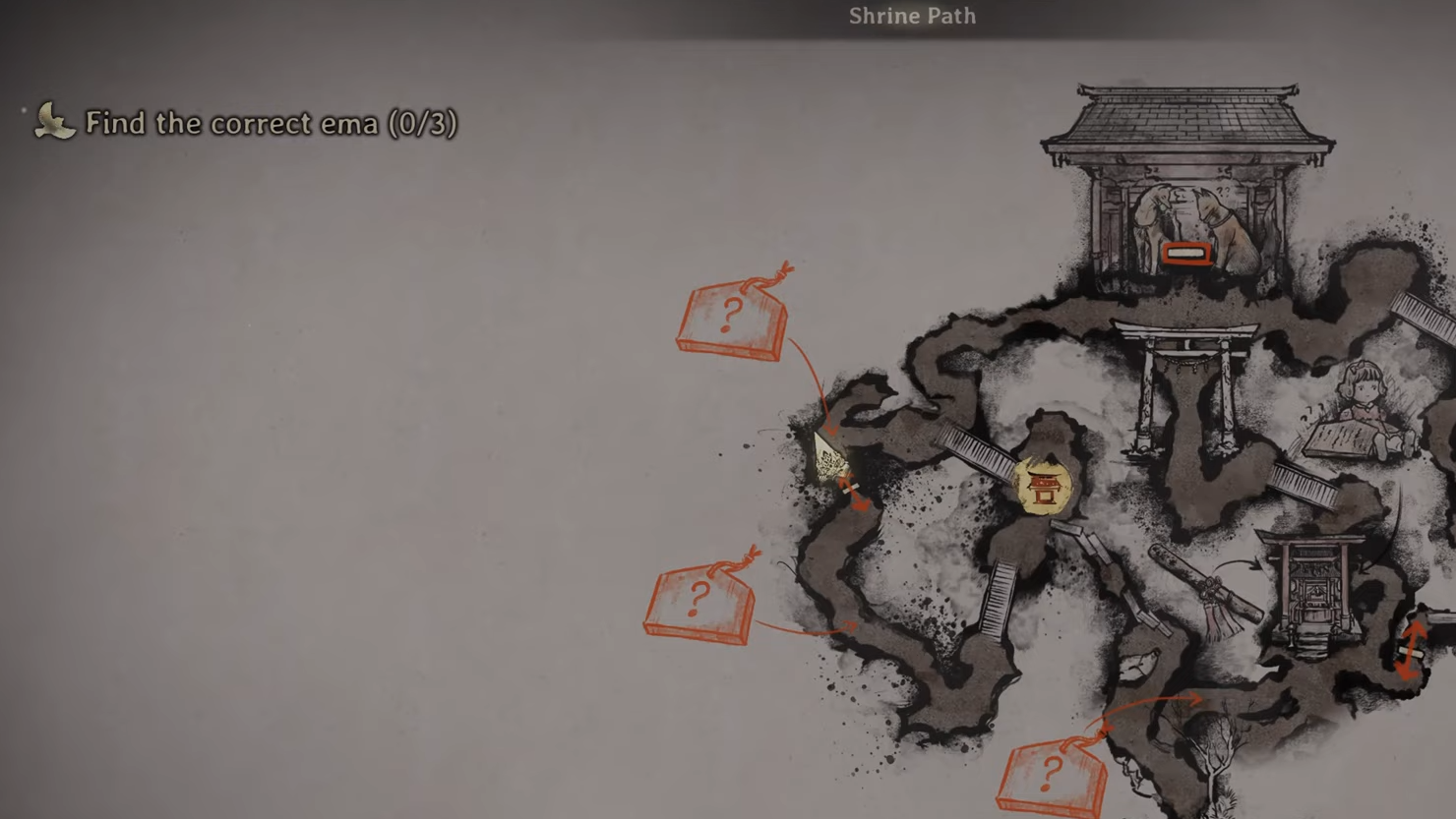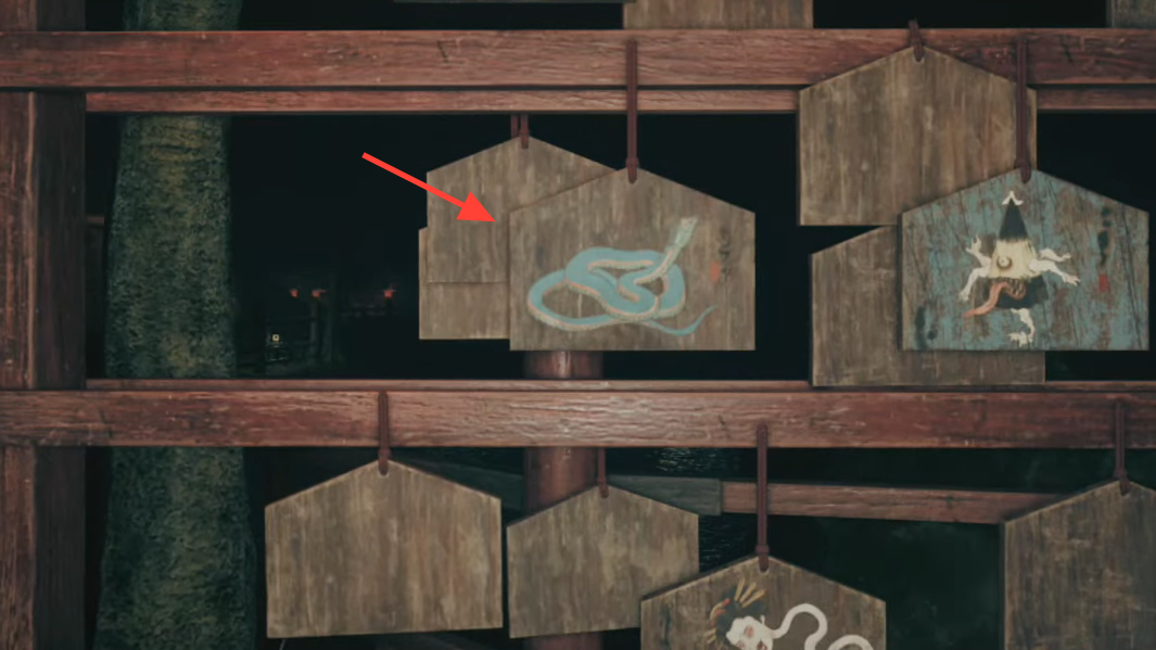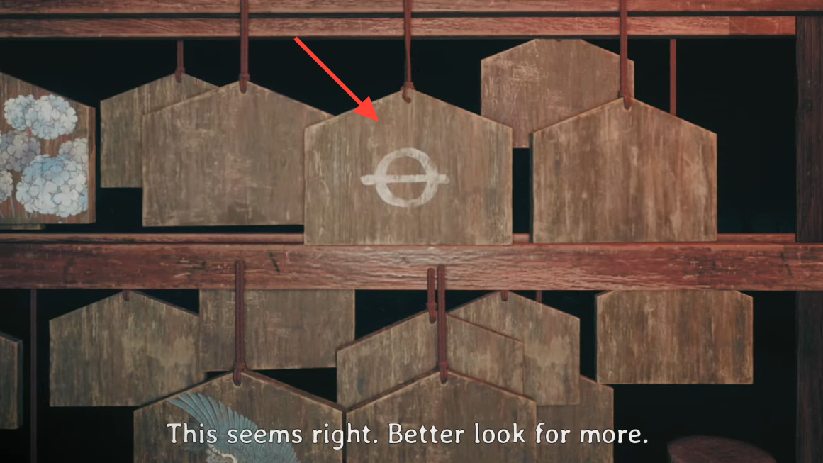 Once you reach the Inari altar, turn away from it (facing south). You’ll see two short, dead-end paths opposite the altar; take the one that runs southwest parallel to the Ema. Clear the obstruction with your dagger, then revisit nearby Ema and flip plaques to hunt for symbols that match the vault’s clue.