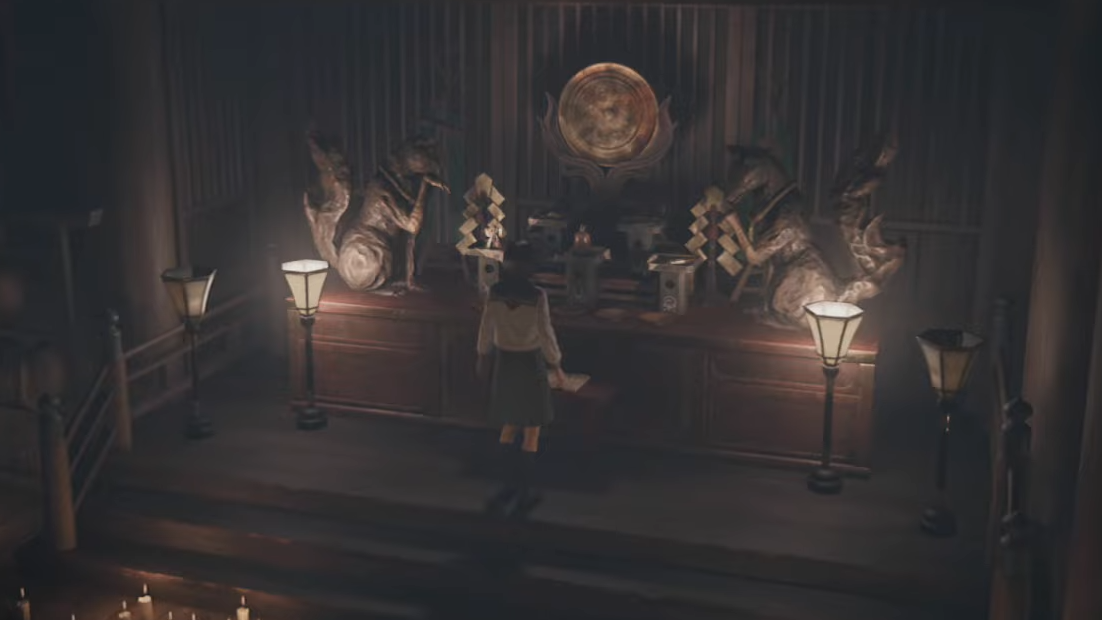 Silent Hill f’s Light puzzle appears in the Dark Shrine Worship Hall, during the “Farewell Ceremony” path. The room centers on two pairs of animal statues—fox and rabbit—that you rotate to manipulate a set of hanging cages. When the cages are brought to the same height, you can retrieve two lampshades and use them to produce the key you need to progress.