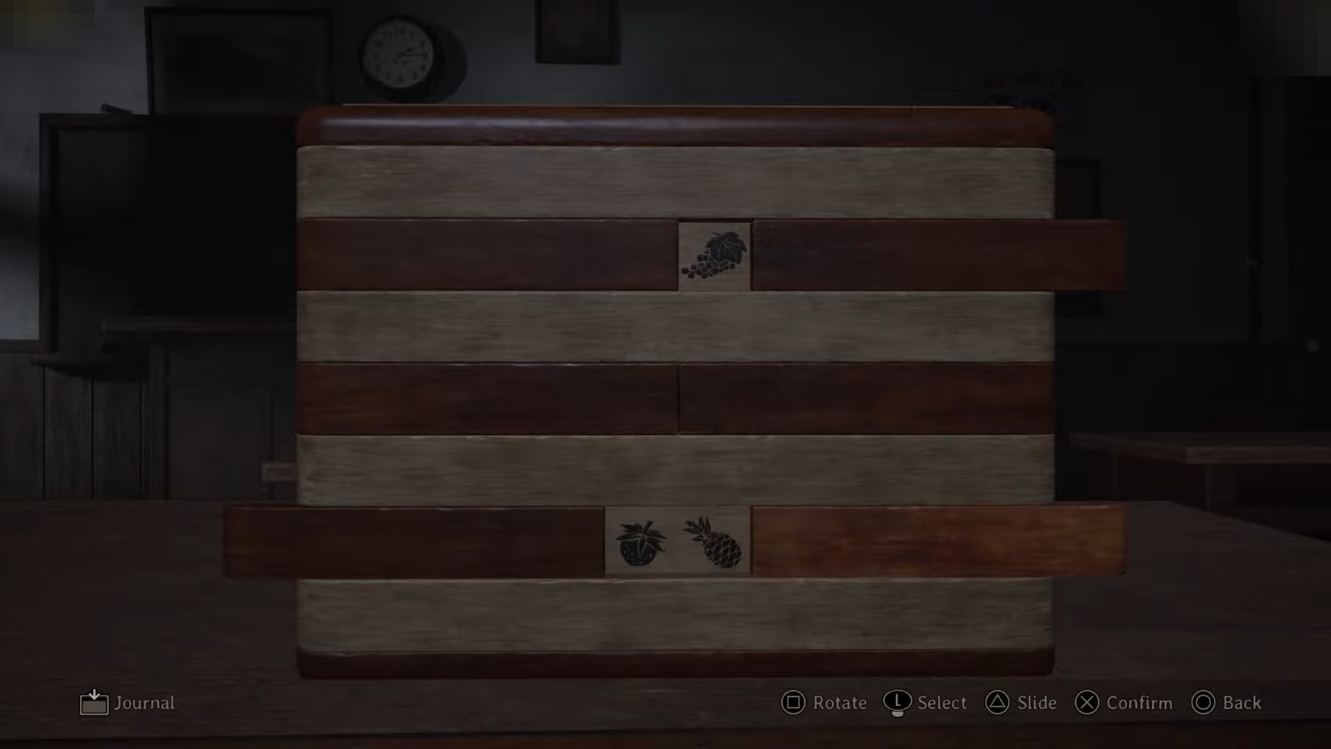 Each layer of the box has two faces (front and back). Every face contains multiple sliding tiles engraved with different motifs—fruit, books, plants, and more. Your goal in each round is to slide panels so that only the tiles referenced by the current letter are visible. When both faces simultaneously show only the correct symbols, that layer opens and reveals the next letter inside.