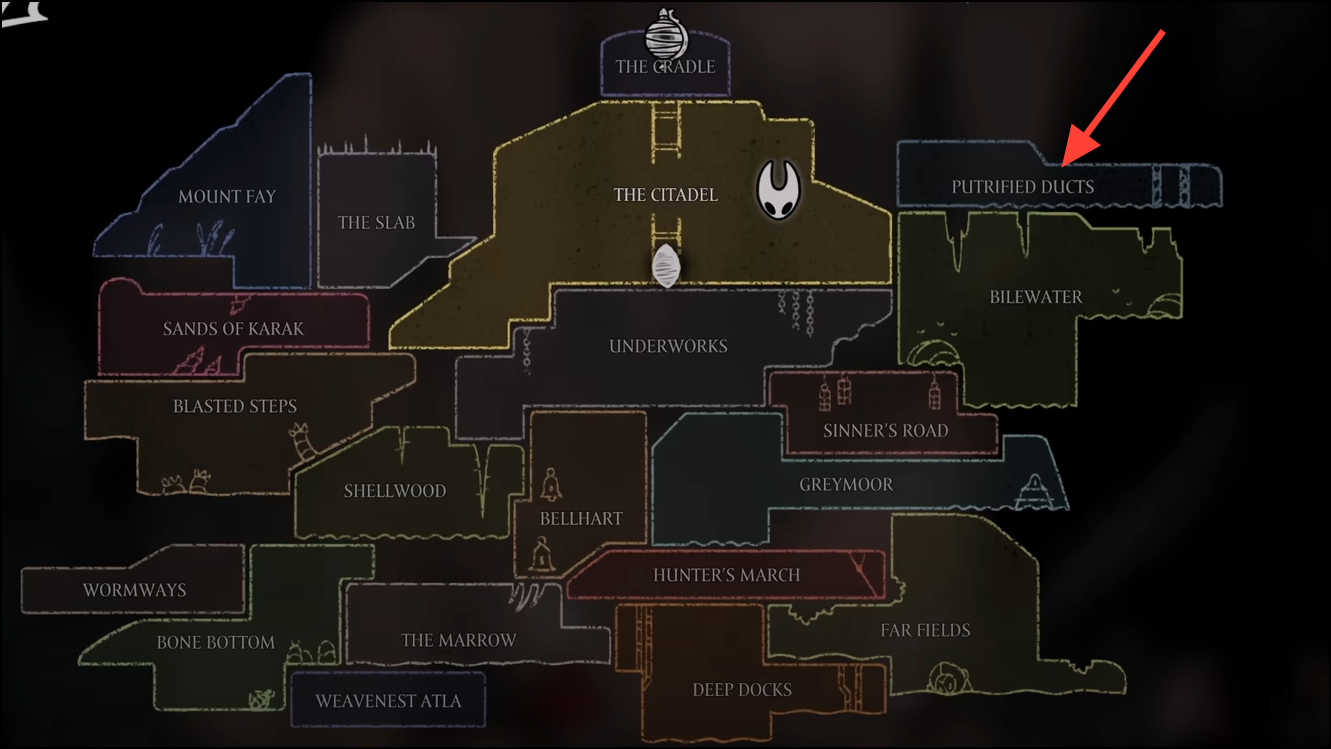 - Find Pale Lake first: Reach Putrified Ducts to the right of the Memorium and above Bilewater, then head to the far eastern shoreline. When you step close enough, Hornet marks it as safe. That discovery flag must be set before the caravan agrees to move there.
