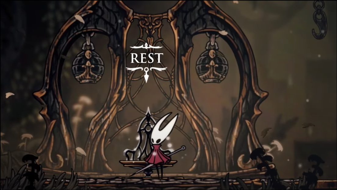Step 5: Return via the narrow climb to find the bench now functioning. Rest to set your local respawn and clear any infestation. You can pogo on the bench bells to reach a small cache on the upper-right ledge nearby.