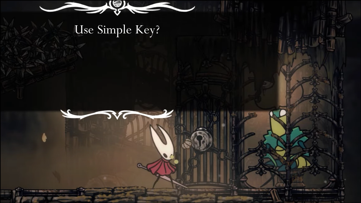 Step 1: Climb the eastern shaft to the top again. Thread a precise spike-jump segment near the ceiling to a levered platform where a Roachkeeper spawns. Defeat it to obtain the Simple Key.