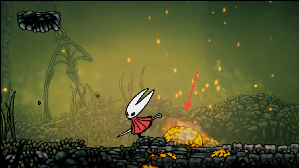 Return to the central shaft and descend. You’ll see orange growths embedded in rock; breaking these opens vents you’ll use later with your glide. At the base, watch the lava, then slip left into a dim alcove where sunlight filters down. Leap up to reveal a tucked-away room containing the Warding Bell. Equip it when you need safer heals: it shields Hornet while Binding.