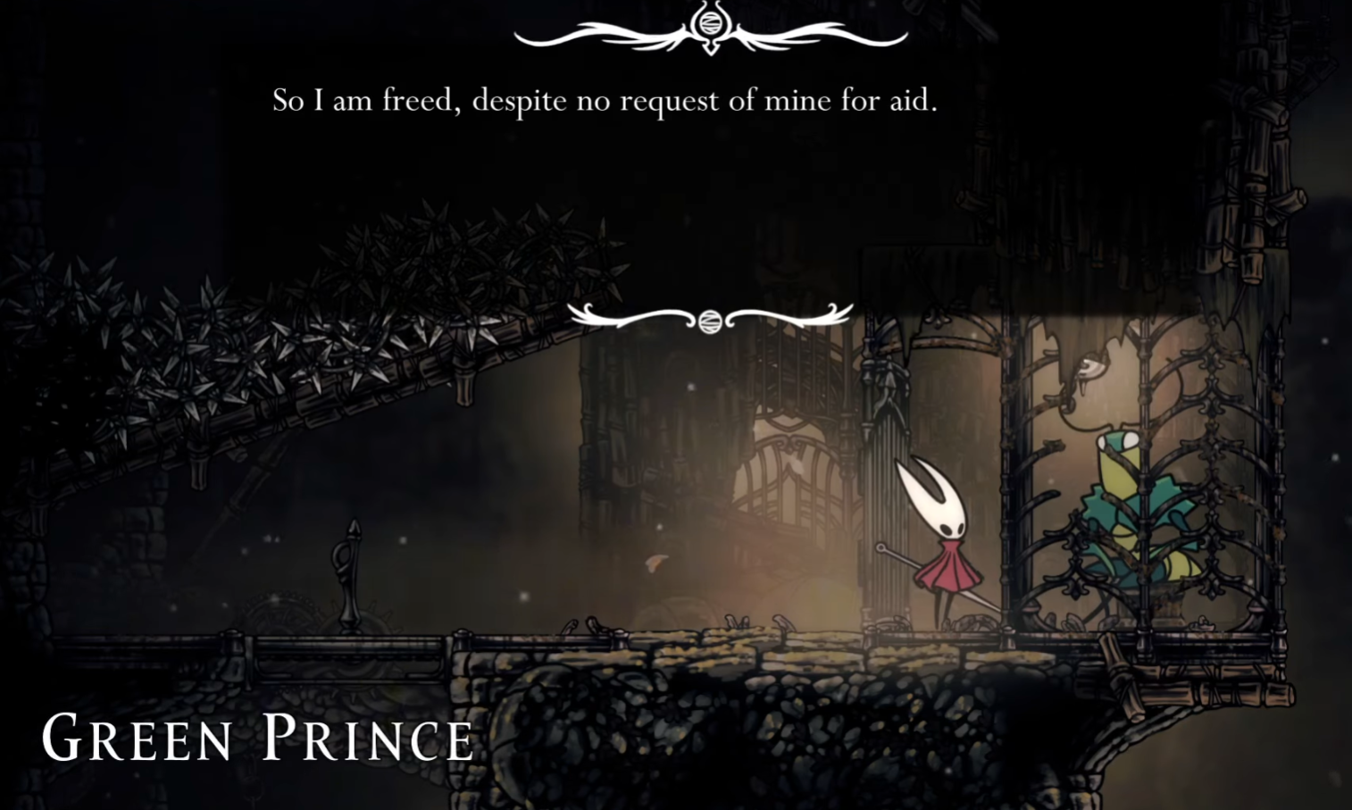 You’ll first meet the Green Prince in Sinner’s Road, an area reached from the top-right of Greymoor. Push right through the opening rooms, using levers to drop trapdoors as you go. After a short loop downward and left through a side passage (watch for grabby parasites on the way), you’ll arrive at the base of a columned section with the Green Prince sitting behind bars.