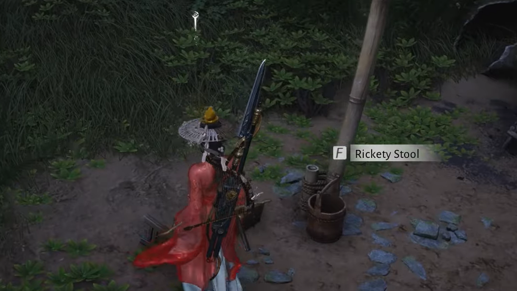 Step 1: Interact with the broken bench near the merchants’ table to pick up the Rickety Stool.