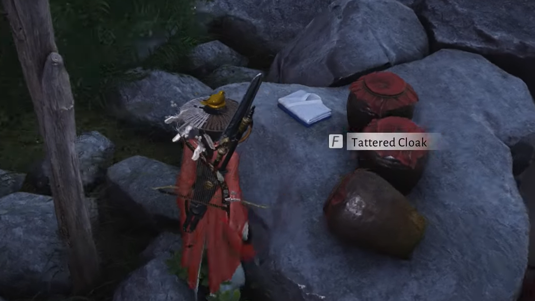 Step 2: Check near the jars to the side of the shop and pick up the Tattered Cloak.