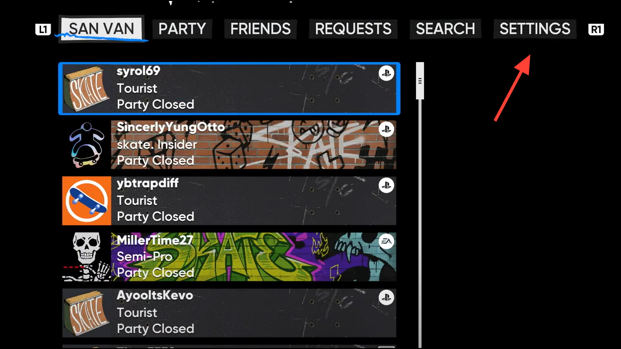 Step 2: Go to the Settings tab. This houses contact permissions for parties and friend requests.