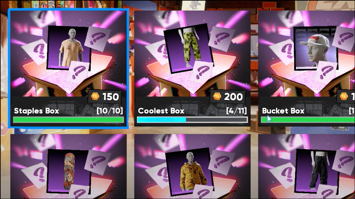 - Store navigation: Open the main menu while in a lobby, tab to Store, then scroll to view boxes by district.
