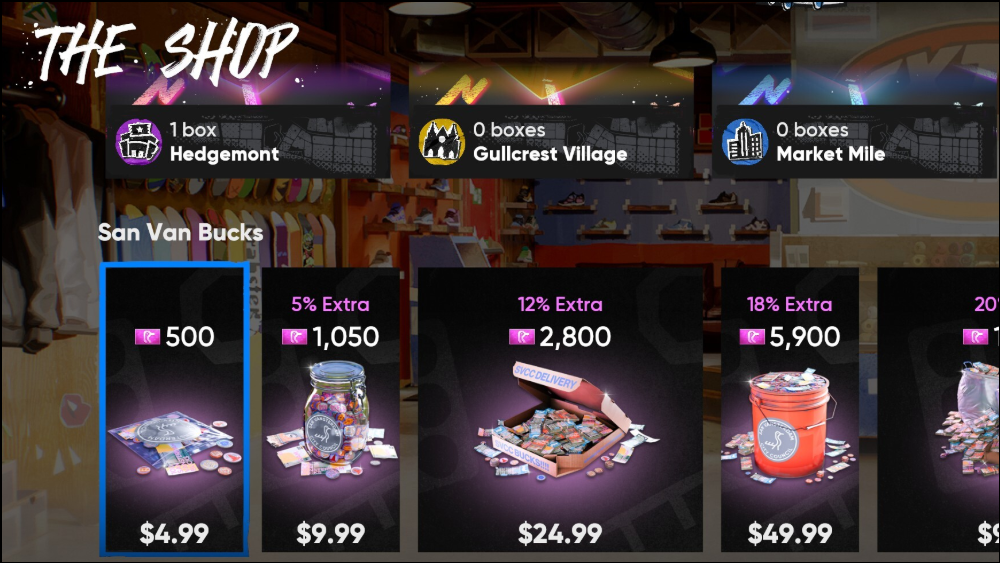 Skate uses two currencies. Rip Chips are earned strictly by playing, and San Van Bucks are the optional premium currency. In the Store tab (rightmost tab on the top bar from the main menu), your balances appear at the top; Rip Chips use an orange hexagon icon, and San Van Bucks use a pink bird icon. Boxes that consume Rip Chips to unlock cosmetics are placed near the bottom of the Store page, grouped by neighborhood.