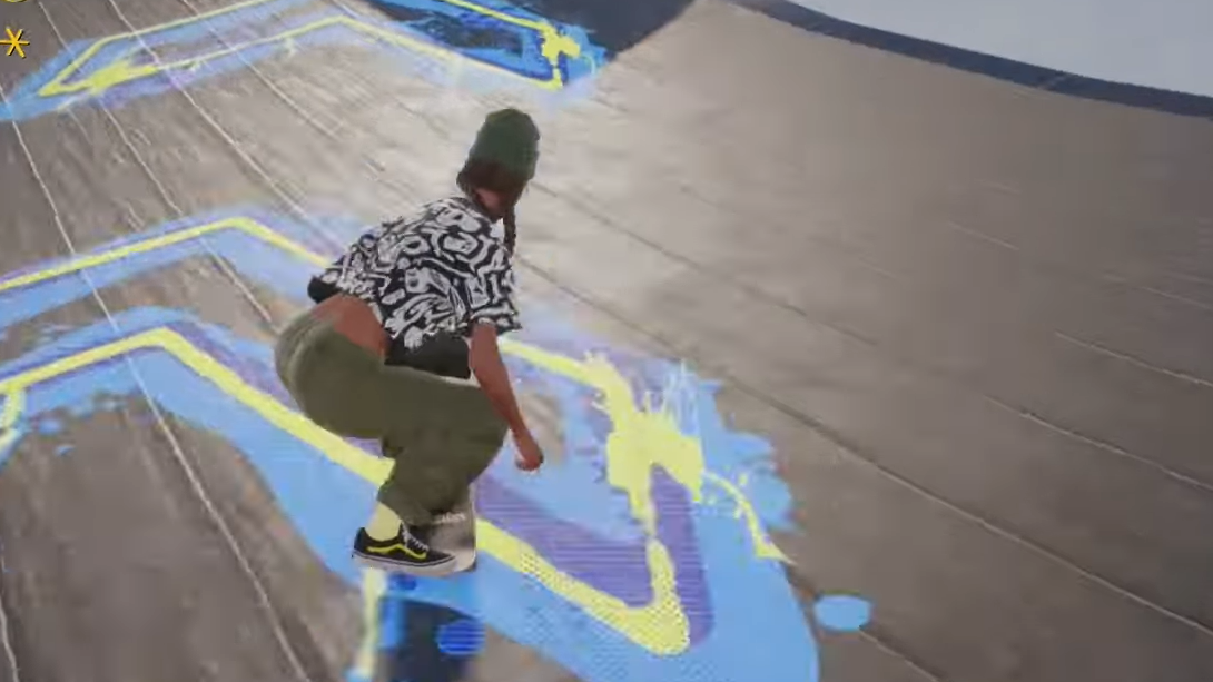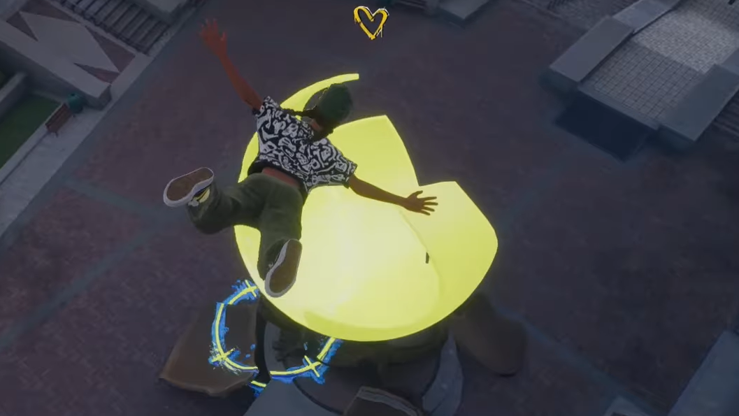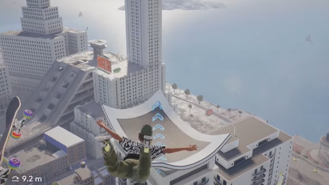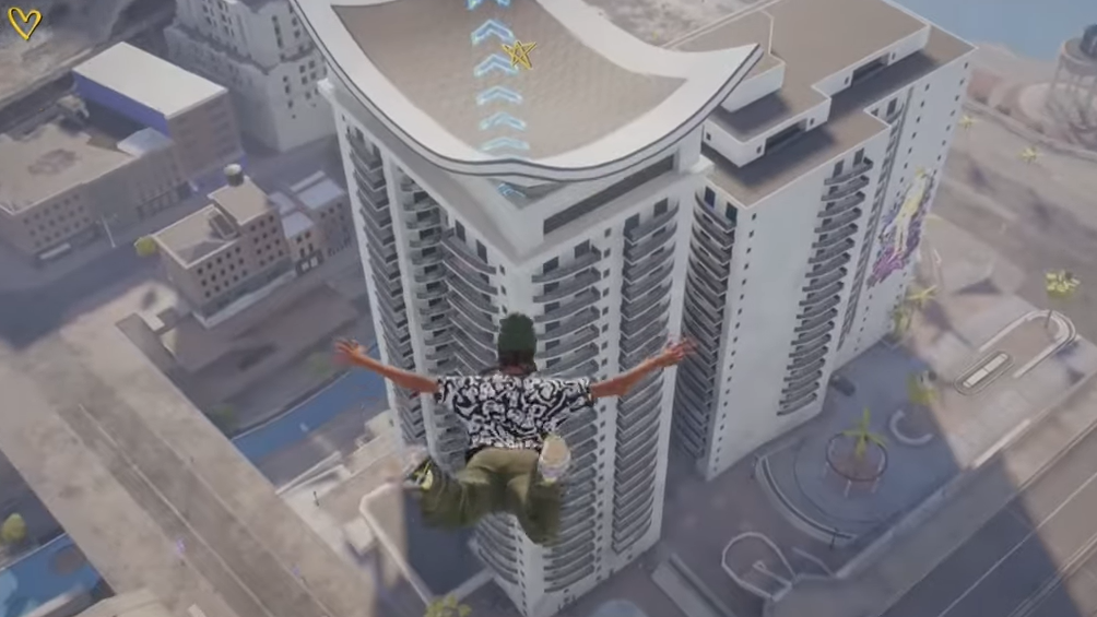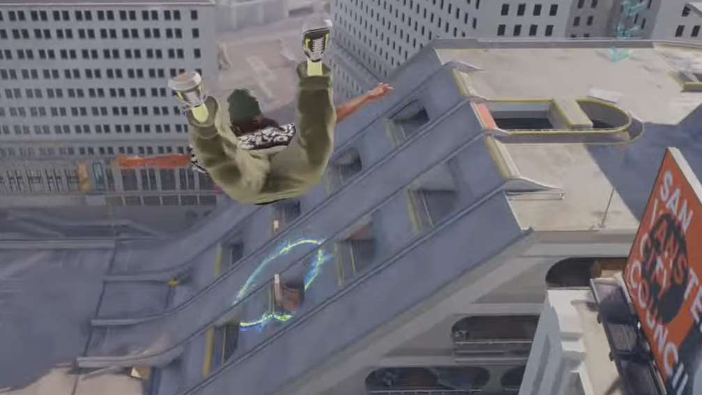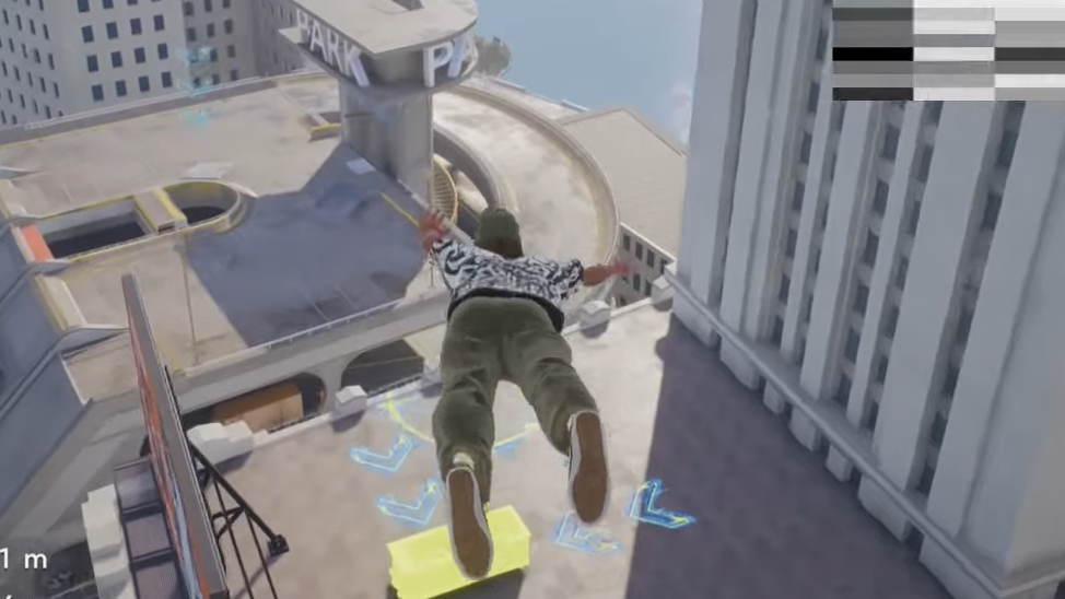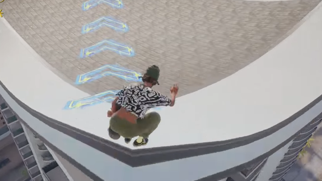 Step 1: Commit to an immediate Spread Eagle off the start rooftop to swing around the curved roof’s outside. Keep your path wide to avoid scraping the corner.