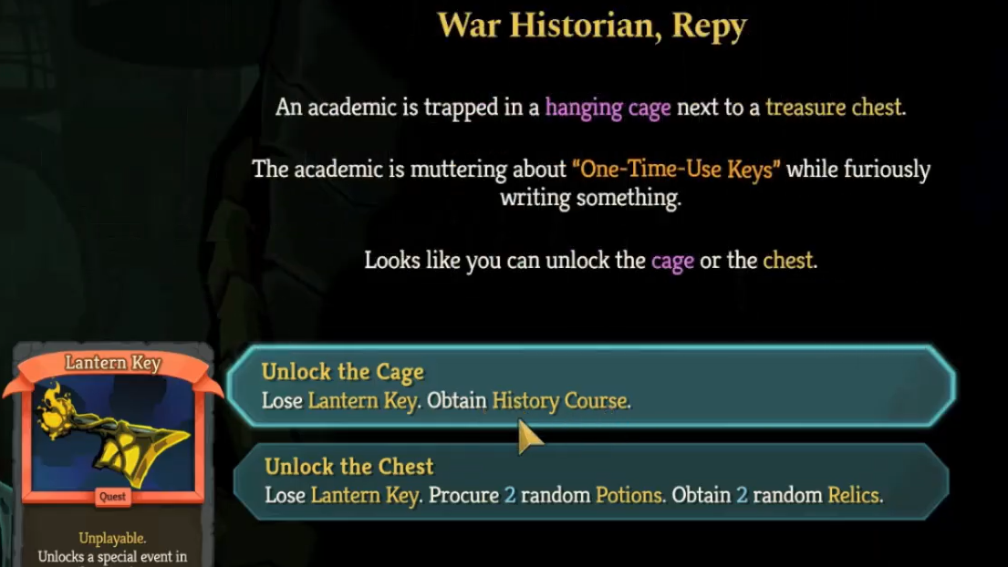 Using the Lantern Key at the Act 3 event opens a reward choice. One option grants a relic that repeats the last card played on the previous turn for free.