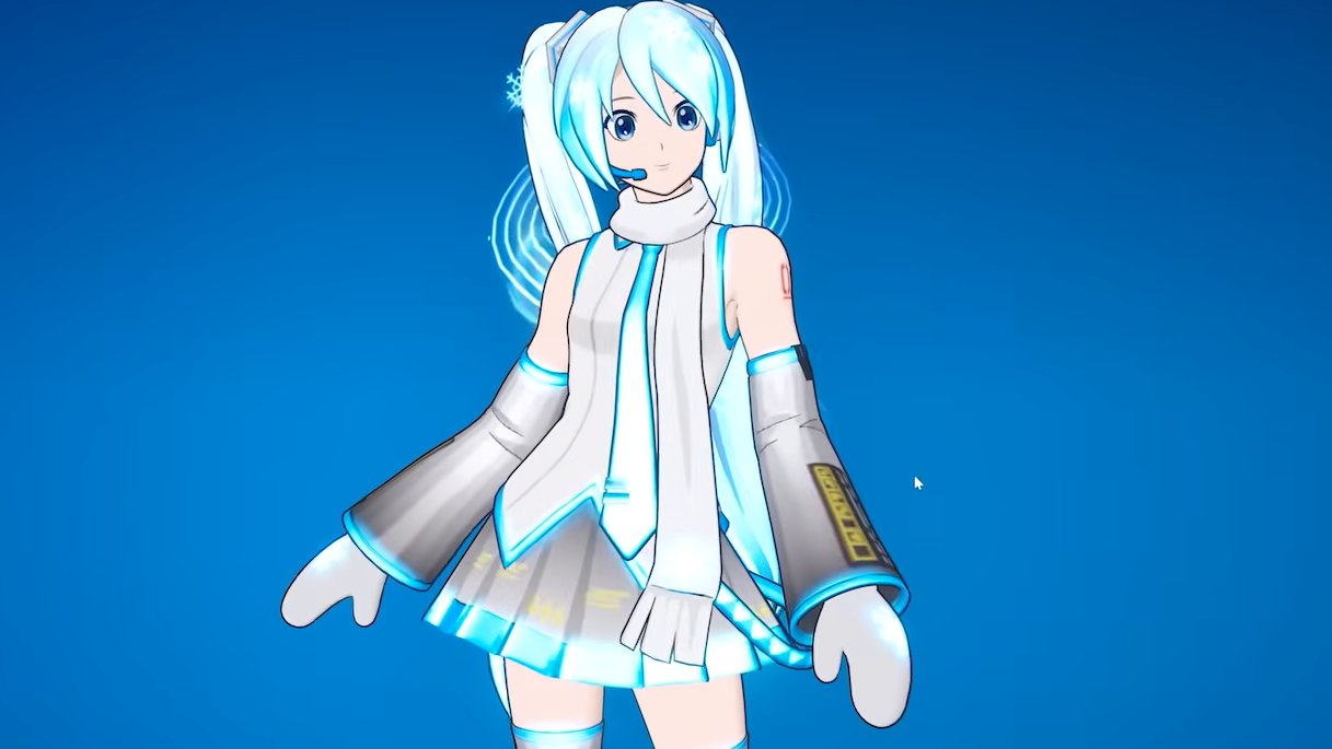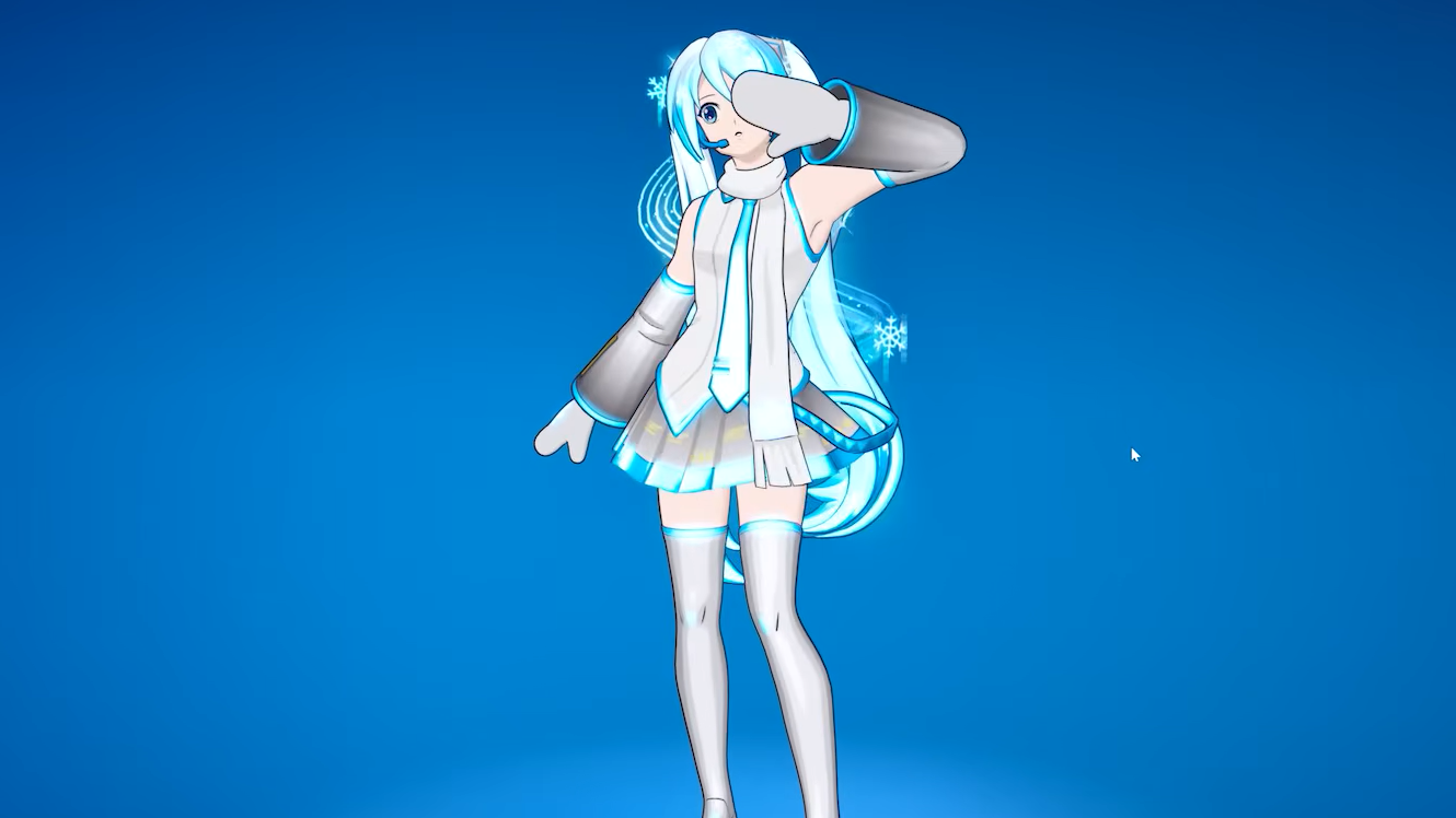 Snow Miku is built as a winter remix of Fortnite’s existing Hatsune Miku design, closely echoing the classic Snow Miku 2011 look: icy color palette, scarf, mittens, and cold-weather details layered over her standard silhouette.