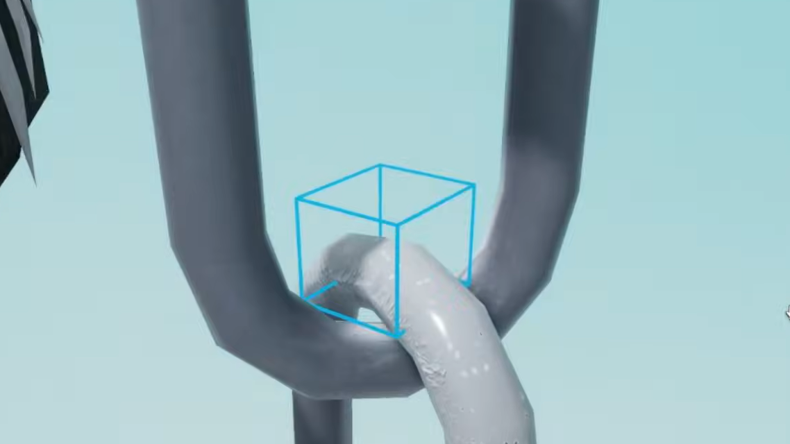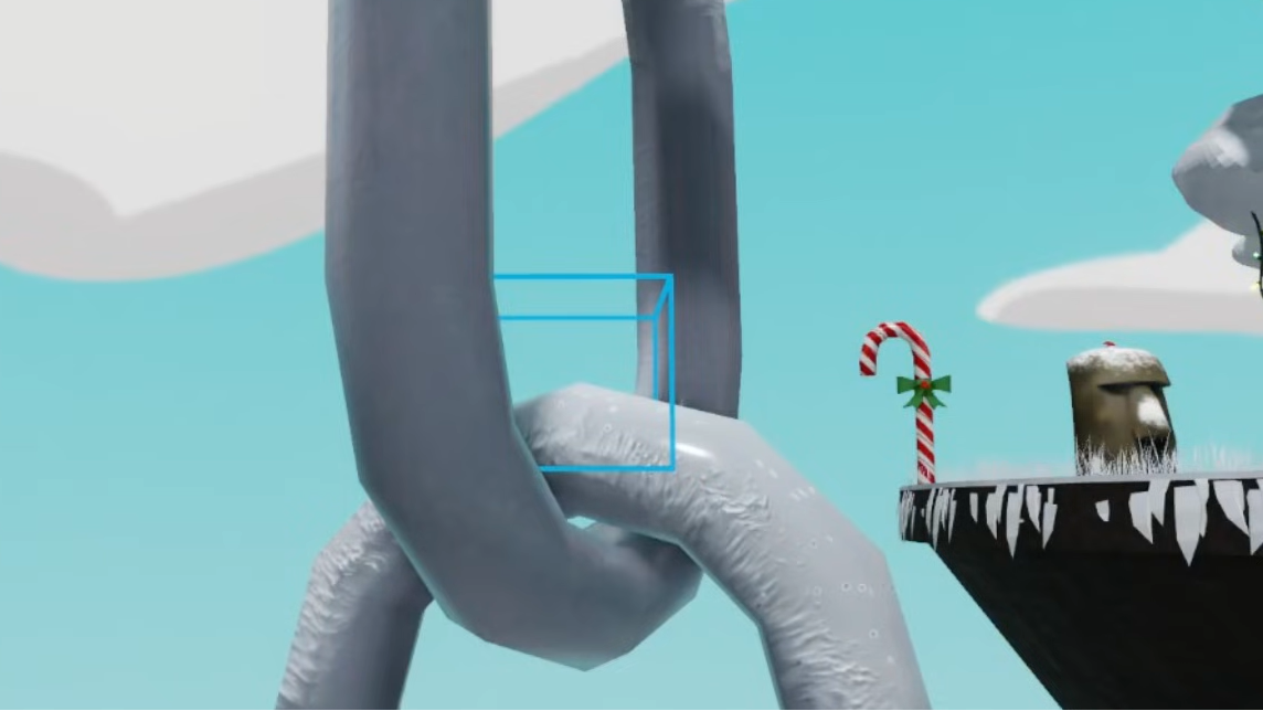 Step 2: Drop down carefully onto the chain links. Between two adjacent rings, roughly midway along the chain and near the ladder that climbs back up, you’ll see the Snow Peep.