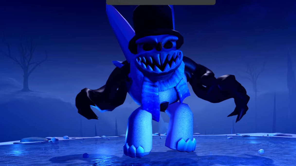 The Jerry The Snowman boss takes place in a circular arena of ice above a spiked tundra. Jerry has a 300 HP main body plus limb health that must be stripped before you can damage him. Each time you deal 100 HP to Jerry’s core, the fight transitions into a new phase, and his limbs regenerate, forcing players to break them again.