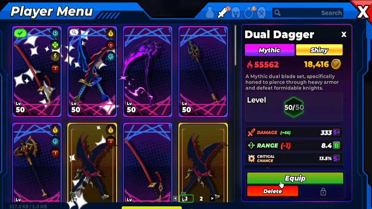 - Dual Dagger – Shares the same skill tree as swords, but with faster attack speed and very competitive DPS. It drops in Spider Cave or can also appear at the Summon Power NPC. In terms of raw power it sits just under Shadow Scythe and Thunder Axe, but it is extremely flexible and smooth to play.