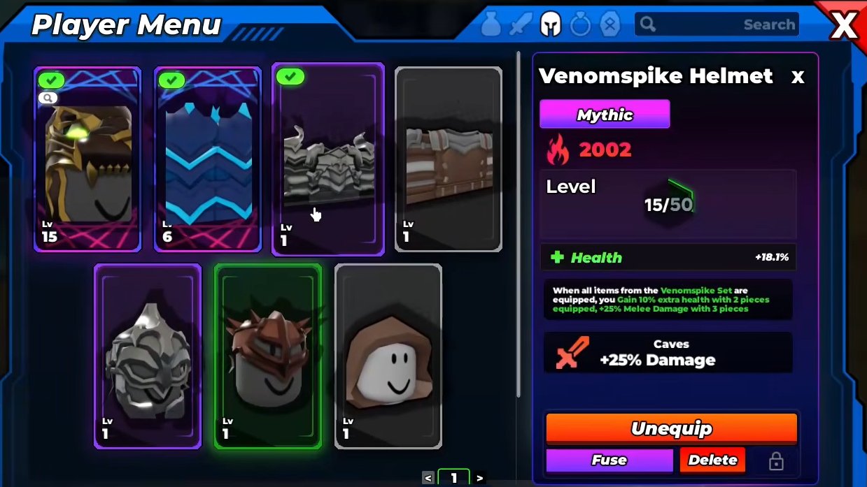 - Venomspike Set – Another S-tier option from Caves. The 2-piece set grants 10% HP, and the 3-piece set also grants +25% Melee Damage. It trades a little HP compared to Serpent but keeps the same damage bonus.