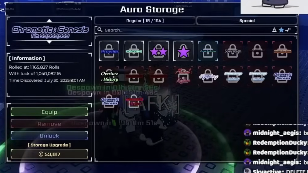 When you roll an aura above certain rarity thresholds, the game plays progressively more dramatic cutscenes. Anything above 1 in 99,999,998 is considered a "global" aura, and the entire server receives a notification when someone lands one. Transcendent auras (above 1 in 1,000,000,000) get fully unique cutscenes with custom music.