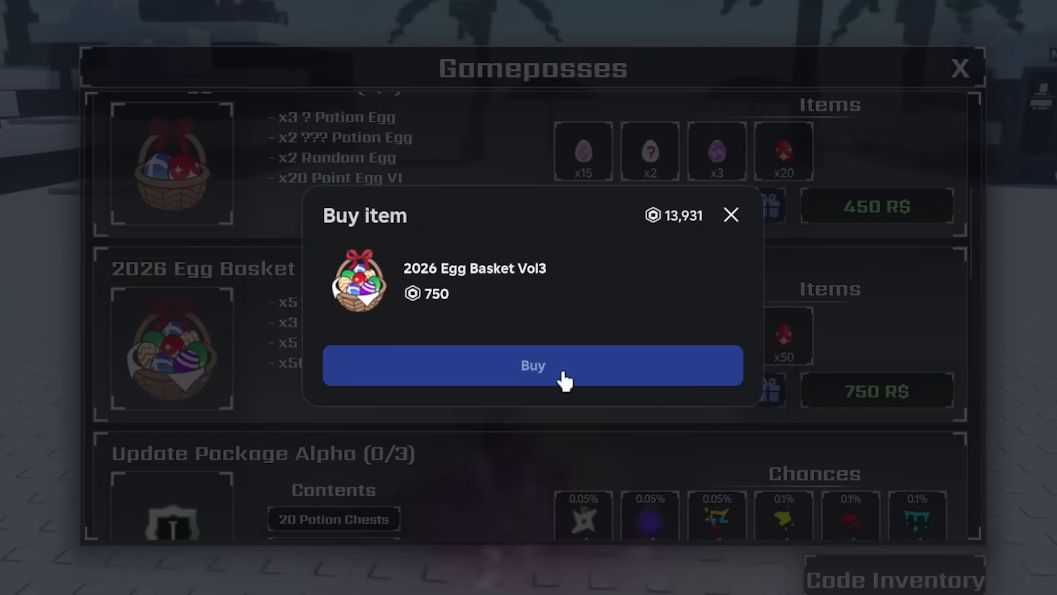 A Random Egg also exists, obtainable through the 2026 Egg Basket Vol1, Vol2, and Vol3 gamepass packages. It awards a random Easter 2026 aura upon use.