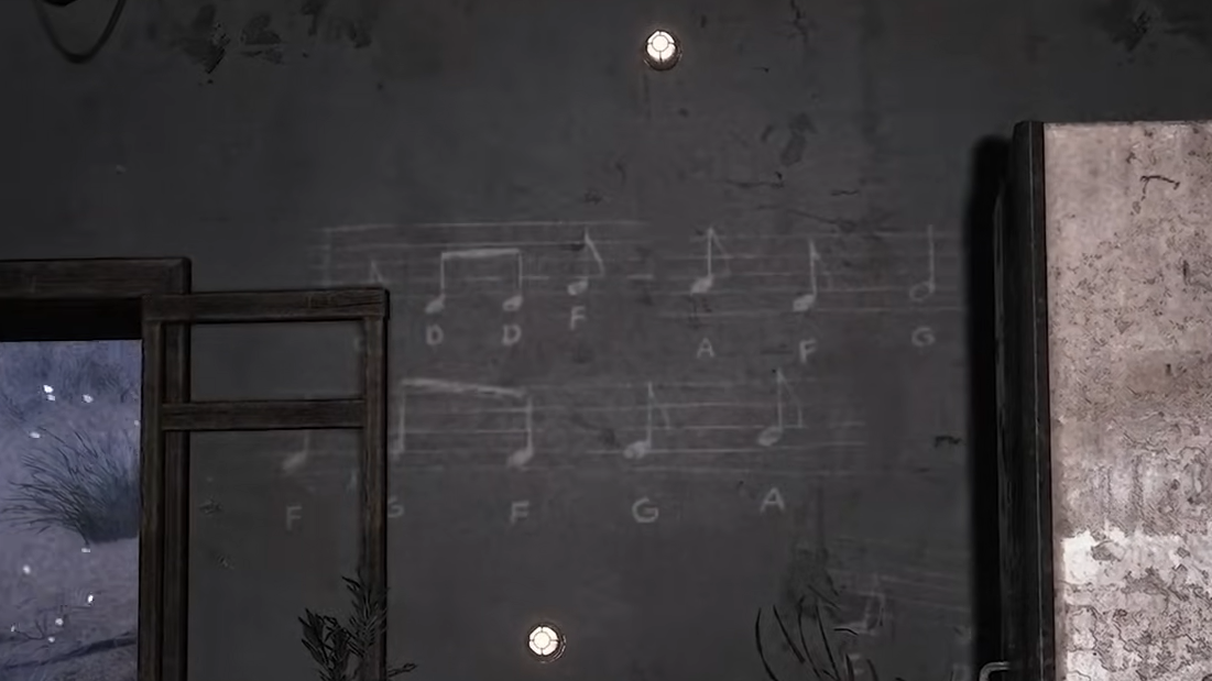 Each of those letters corresponds to a specific red button somewhere in Buried City. There are 15 notes in the sequence and 15 buttons on the map. To open the door, every button must be pressed in the exact order of the notes on the wall. When a button is hit in the correct place in the sequence, it lights up and becomes inactive. If a button is pressed out of sequence, it stays interactable, nothing lights, all progress is wiped, and you must start again from the first button.