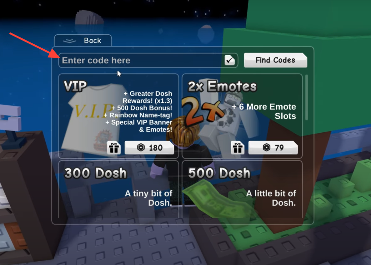 Open the Dosh menu by clicking the green Dosh button or the plus (+) icon next to your Dosh in the bottom‑left. This opens a panel with a code entry field at the top and a white checkmark button. You’re on track if you can place your cursor in a text box labeled for codes. If nothing opens, try clicking the plus (+) icon again once the UI stops animating.
