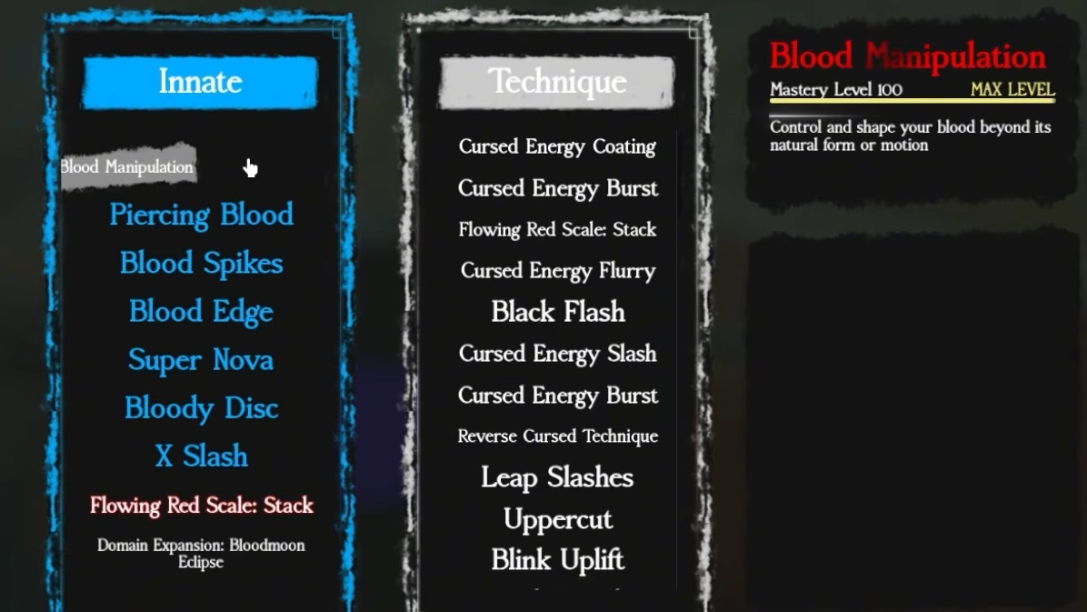 Blood Manipulation mixes ranged, melee, and area attacks for consistent damage. Piercing Blood into Blood Spikes creates strong combos, and ranged moves like Bloody Disc let you kite melee bosses safely. Slow wind-ups leave openings in PvP, so experienced players can dodge and punish. The Choso clan's Stack upgrade adds excellent mobility.