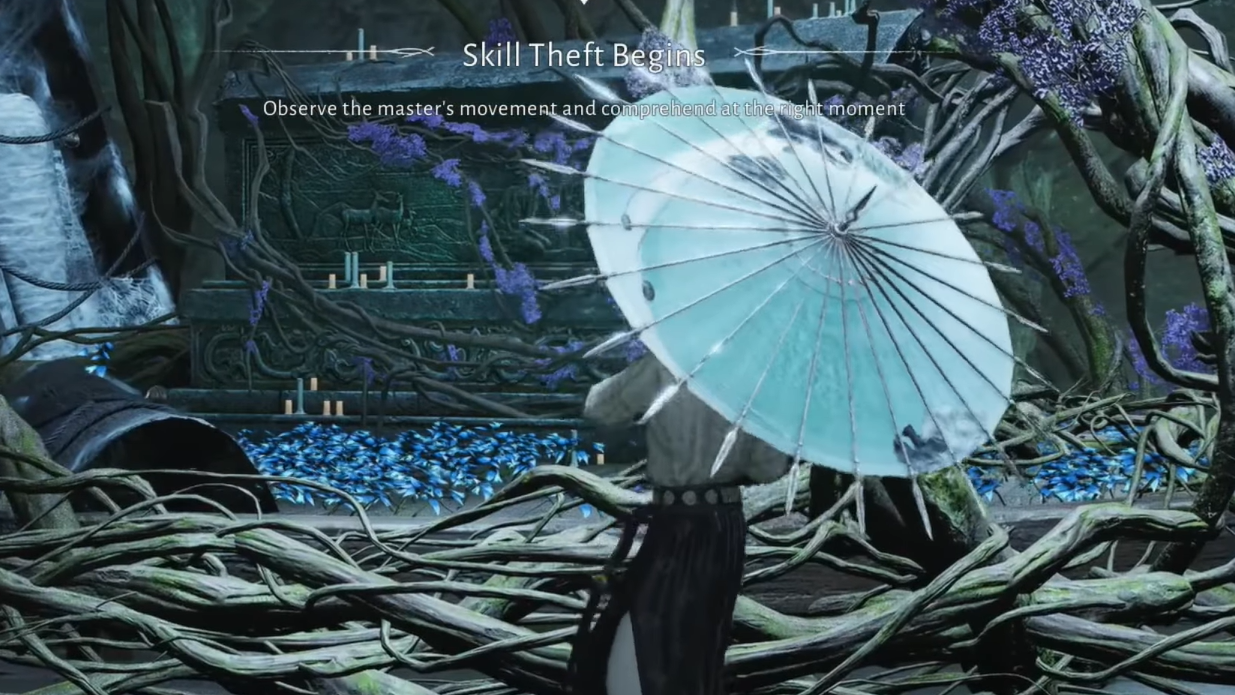 Step 11: From that final chest, go down the torch-lit passage. Climb the branches on the right to reach the objective arena where the master is training. Use Skill Theft on the master to learn the Soulshade Umbrella Martial Art.