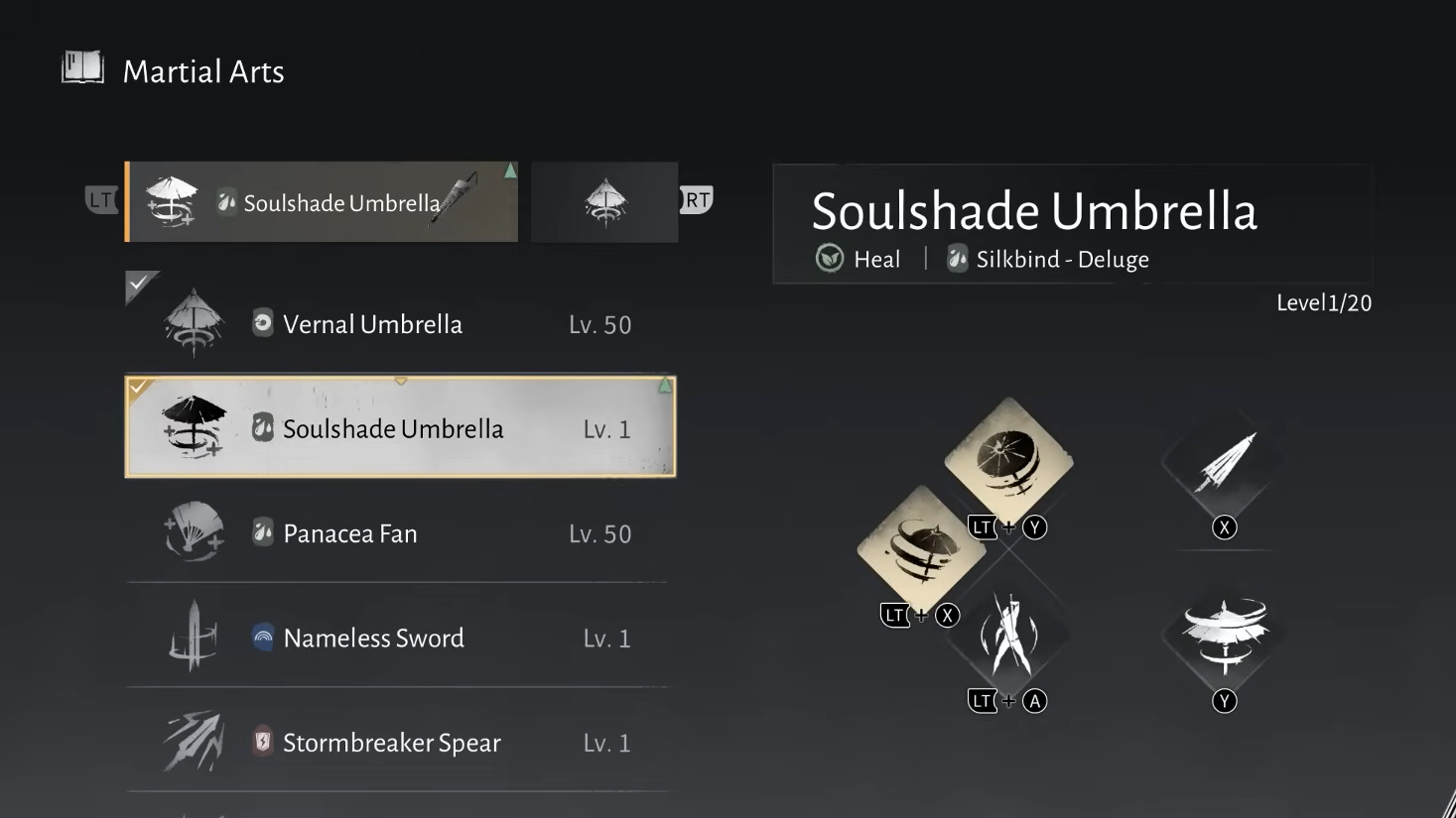 Once the Skill Theft sequence completes, the Soulshade Umbrella is added to your Martial Arts list and can be equipped like any other weapon art.