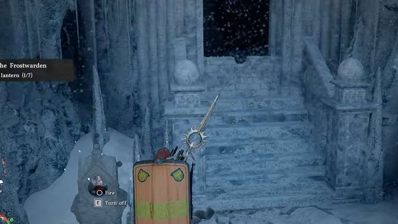 Lantern 3: Turn right at the top of the interior stairs and proceed up the exterior spiral steps. The third lantern is positioned along this outdoor path. Light it after melting the ice.