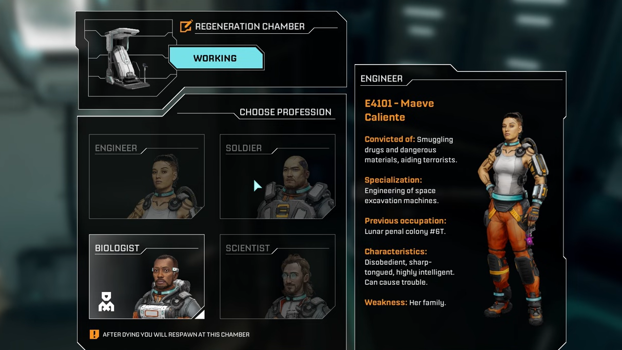 The four starting characters don’t lock you into a build. They differ in voice lines and personality, not in stats or unique perks during Early Access. Pick whoever you like visually; it will not change your access to technologies, weapons, or base parts.