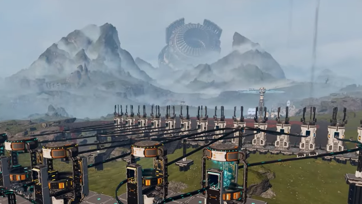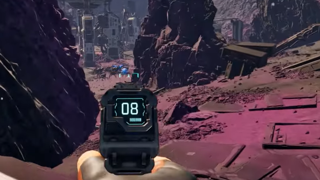 Step 1: Exit the crash zone and face roughly east. Use two big landmarks to orient yourself. On your right, a dark mountain range forms a long ridge. On your left, you’ll see a huge, wheel-like thruster structure rising from the landscape. Your route runs straight between these two features.