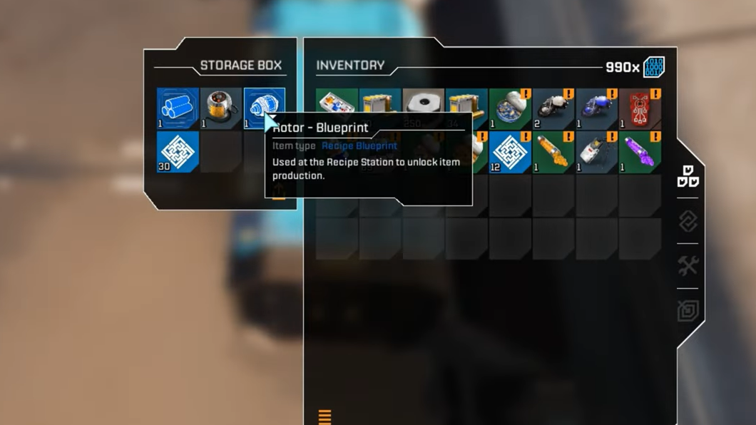 Once collected, the Rotor Blueprint moves into your inventory’s Story tab. To use it, visit a recipe or research station and insert it when prompted so the rotor can enter your crafting pool.