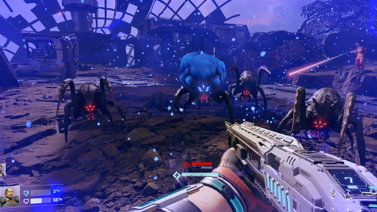 Step 3: The interior of the site is covered in purple residue and broken helium collectors. Expect repeated waves of bugs as you push deeper toward the main buildings. Backtrack down the entry slope when you get overwhelmed; the incline funnels enemies and keeps your firing angles clean.