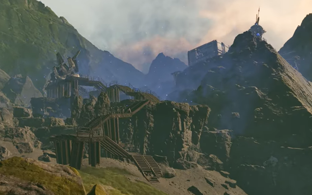 Step 3: Once you are between the mountains, angle right and climb the path that snakes up to the outpost. The facility is perched on a rocky slope with visible platforms, pipes, and a central tower.