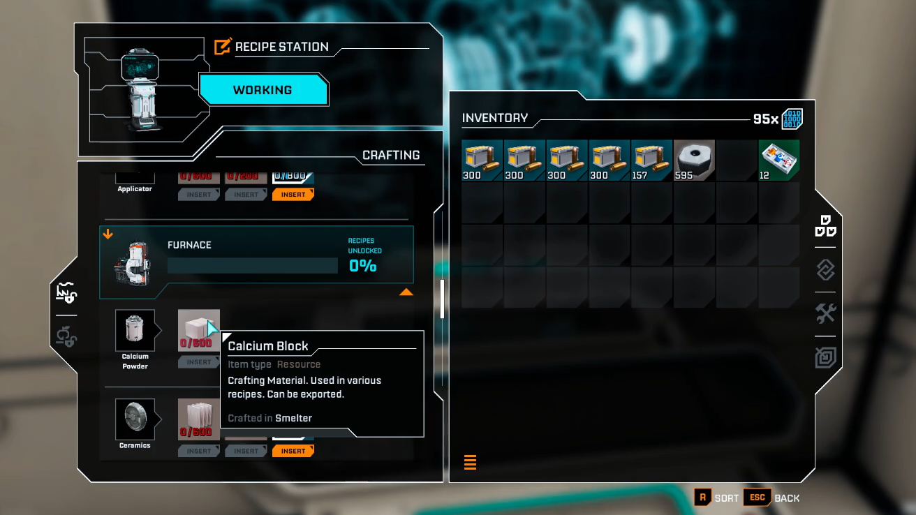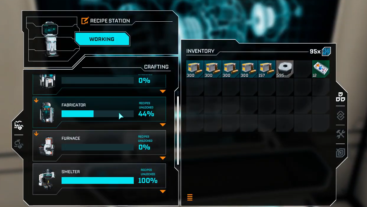 Step 1: Interact with your Recipe Station inside a Habitat. Open the recipes list and switch to the Furnace-related tab, where advanced materials are managed.