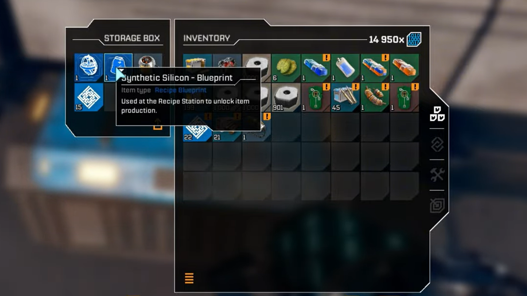 Step 2: Select Synthetic Silicon. With the blueprint in your inventory’s story items tab, the recipe becomes eligible for unlocking, but you still need to pay the material cost.