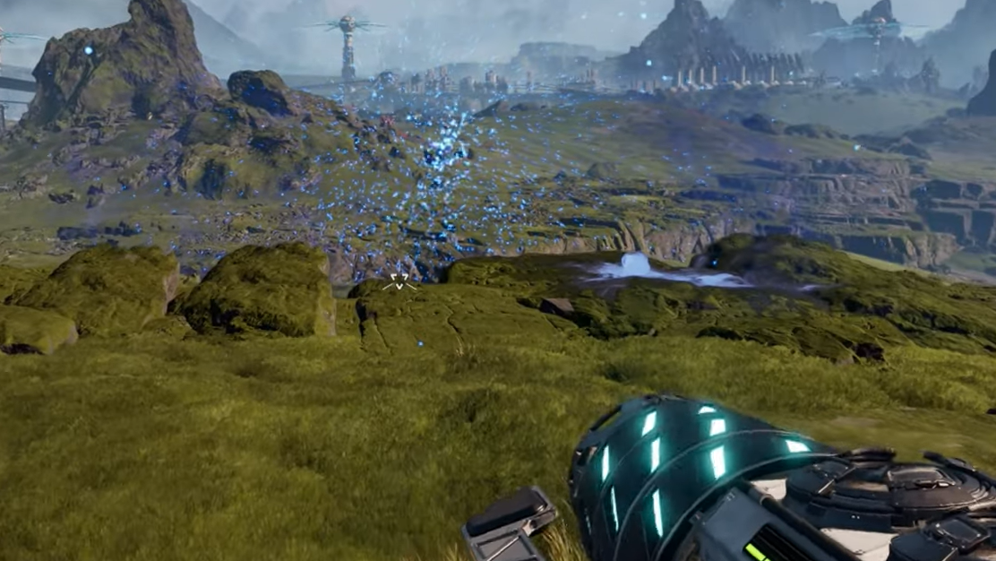 Step 1: Leave the Orbital Lander and head generally north into the grasslands. Keep a tall, sharp-peaked mountain on your left and a broader mountain on your right as rough landmarks. This natural corridor points you toward the northern plateau.
