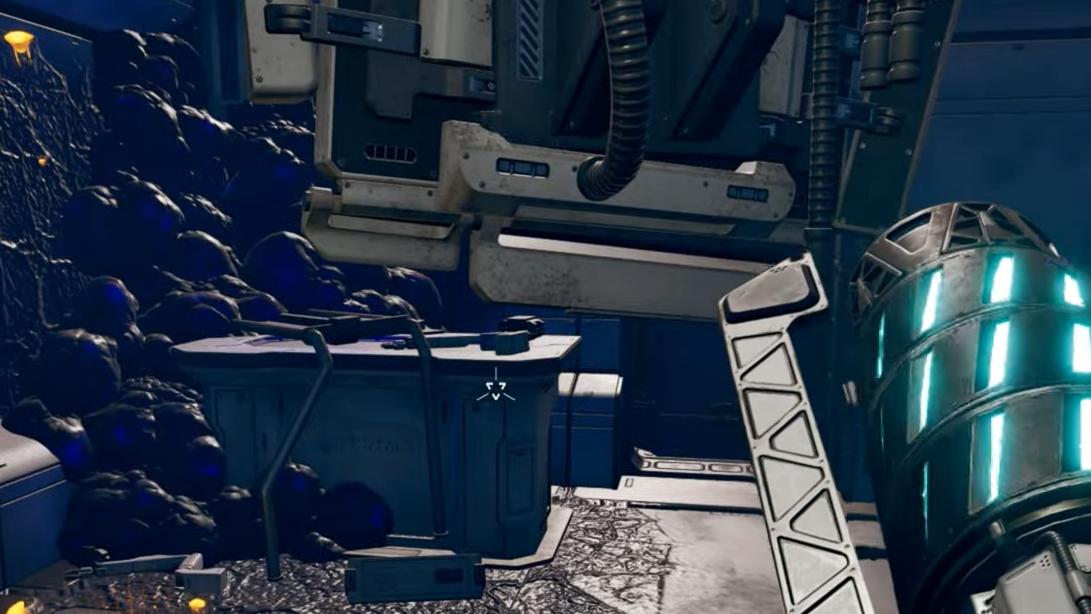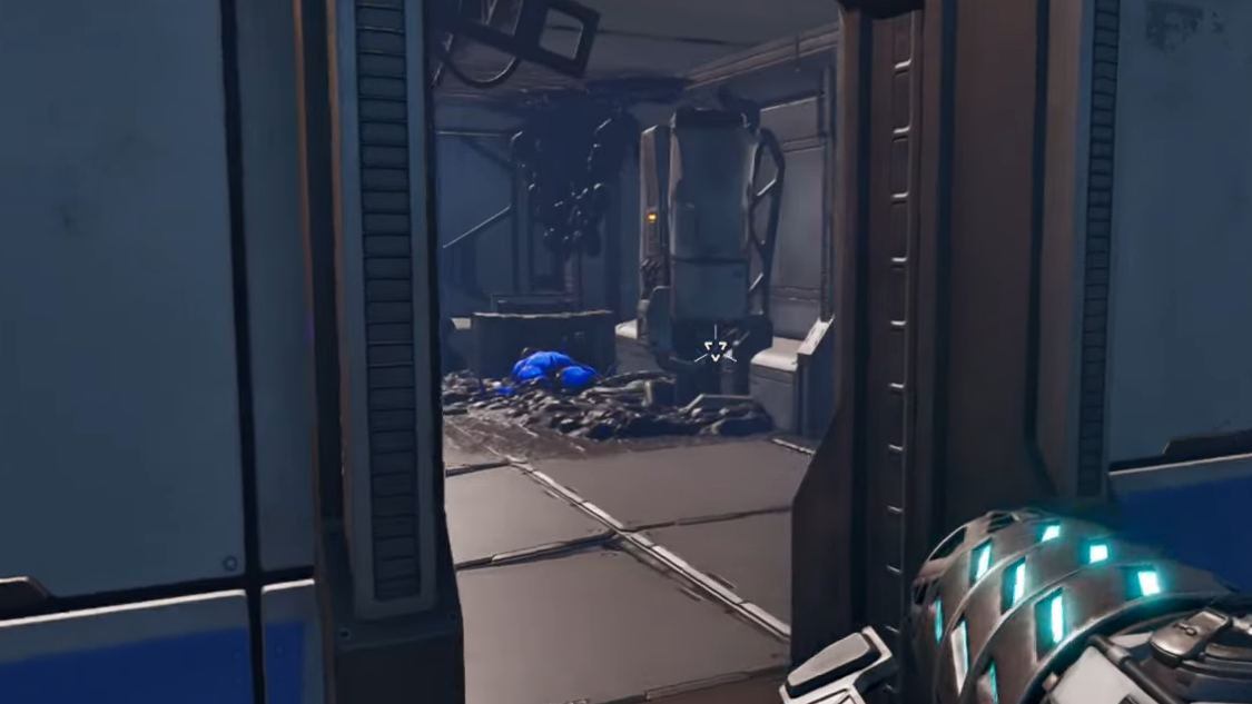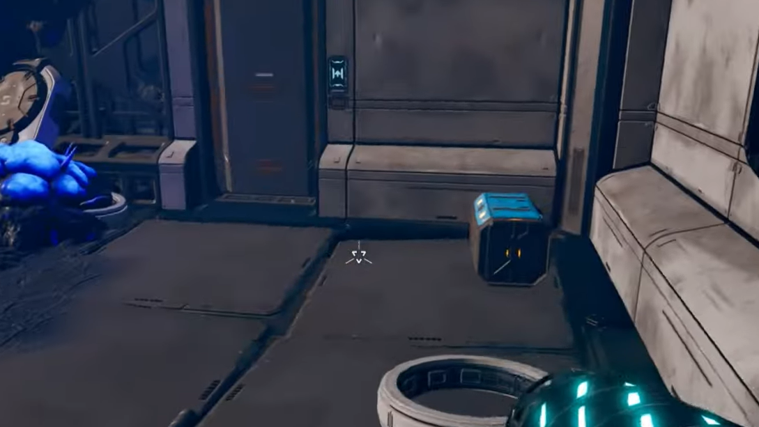 Step 3: Drop carefully through the roof opening into the interior. As you land, you should see a blue storage box or chest directly in front of you on the floor. This specific blue container is the one that contains the Synthetic Silicon blueprint.