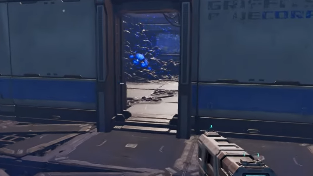 The layout usually includes three main buildings connected by walkways and gantries, along with platforms and under-floor struts that can also host spores. The blueprint you need is inside one of these structures, not in the open air.