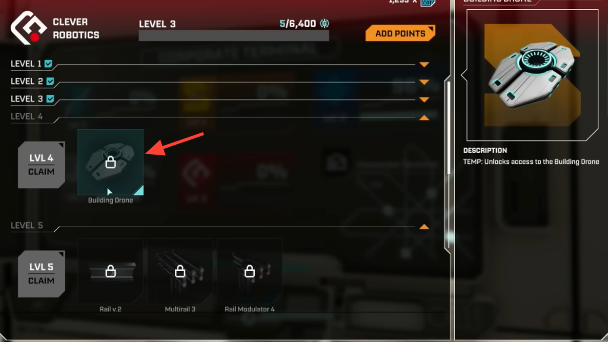 Step 3: Open the Clever Robotics reward screen at Level 4 and claim the Building Drone unlock. The drone becomes part of your standard build toolkit; there is no extra item to equip.