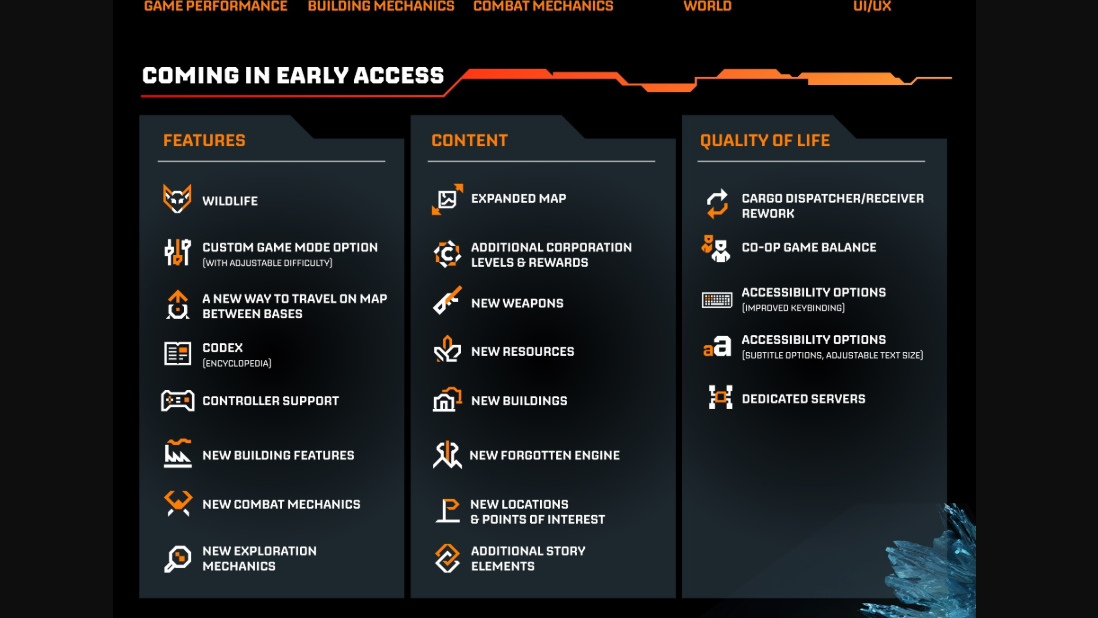 There is no public date for when Early Access ends or when 1.0 will land, so the 1.0 list should be read as an endpoint vision rather than a launch window.