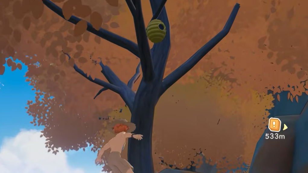 Wild beehives spawn attached to specific tree types and can be extremely hard to see. They appear as small yellow shapes nestled among branches, and they often don't render until you're very close or viewing from the right angle. If you're scanning treetops and coming up empty, try walking right up to the trunk — the leaf canopy fades at close range, revealing the branches underneath.