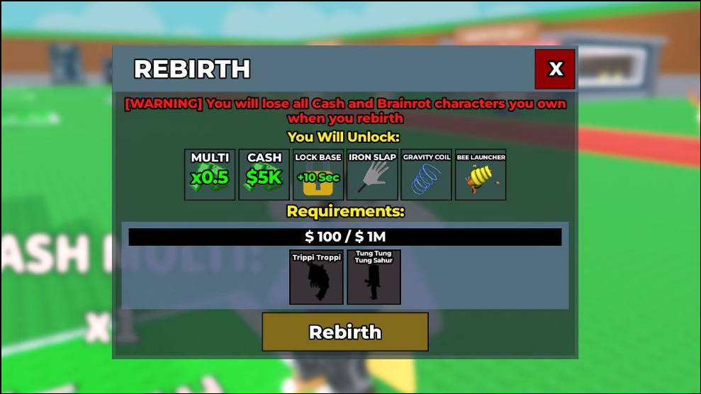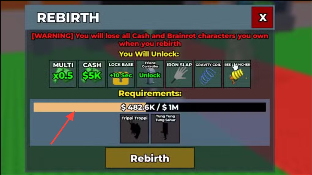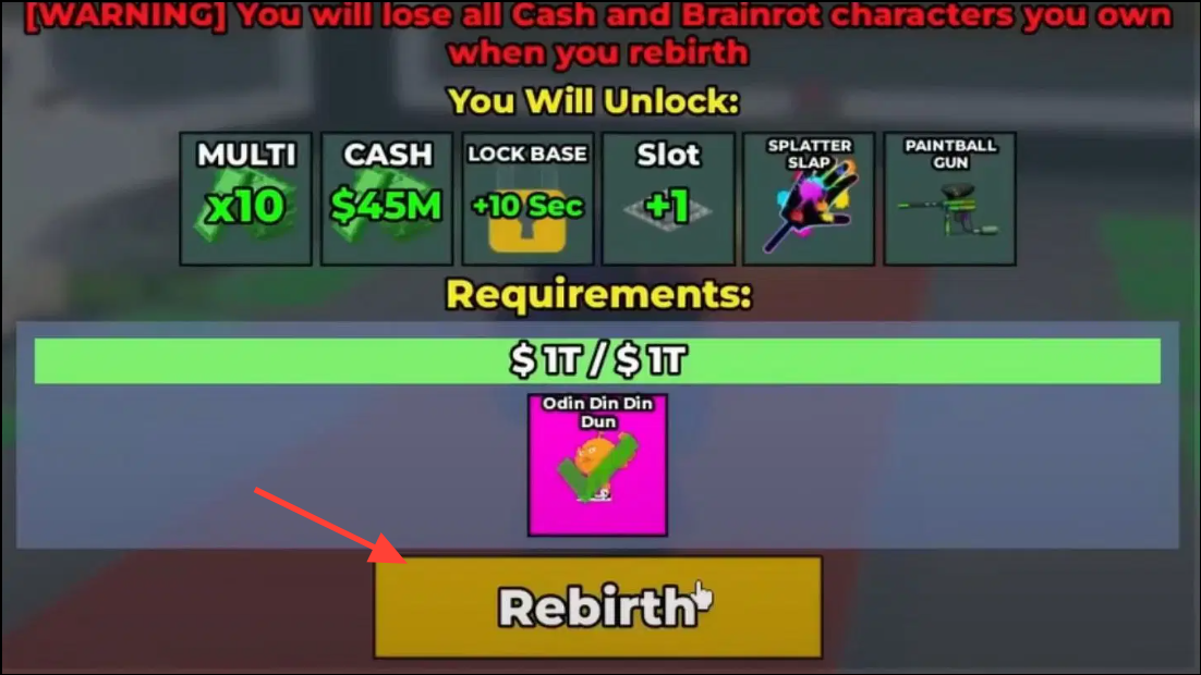 Step 1: Open the Rebirth menu and note the exact requirements for your next tier. For example, the first rebirth requires $1,000,000 plus specific Brainrots.