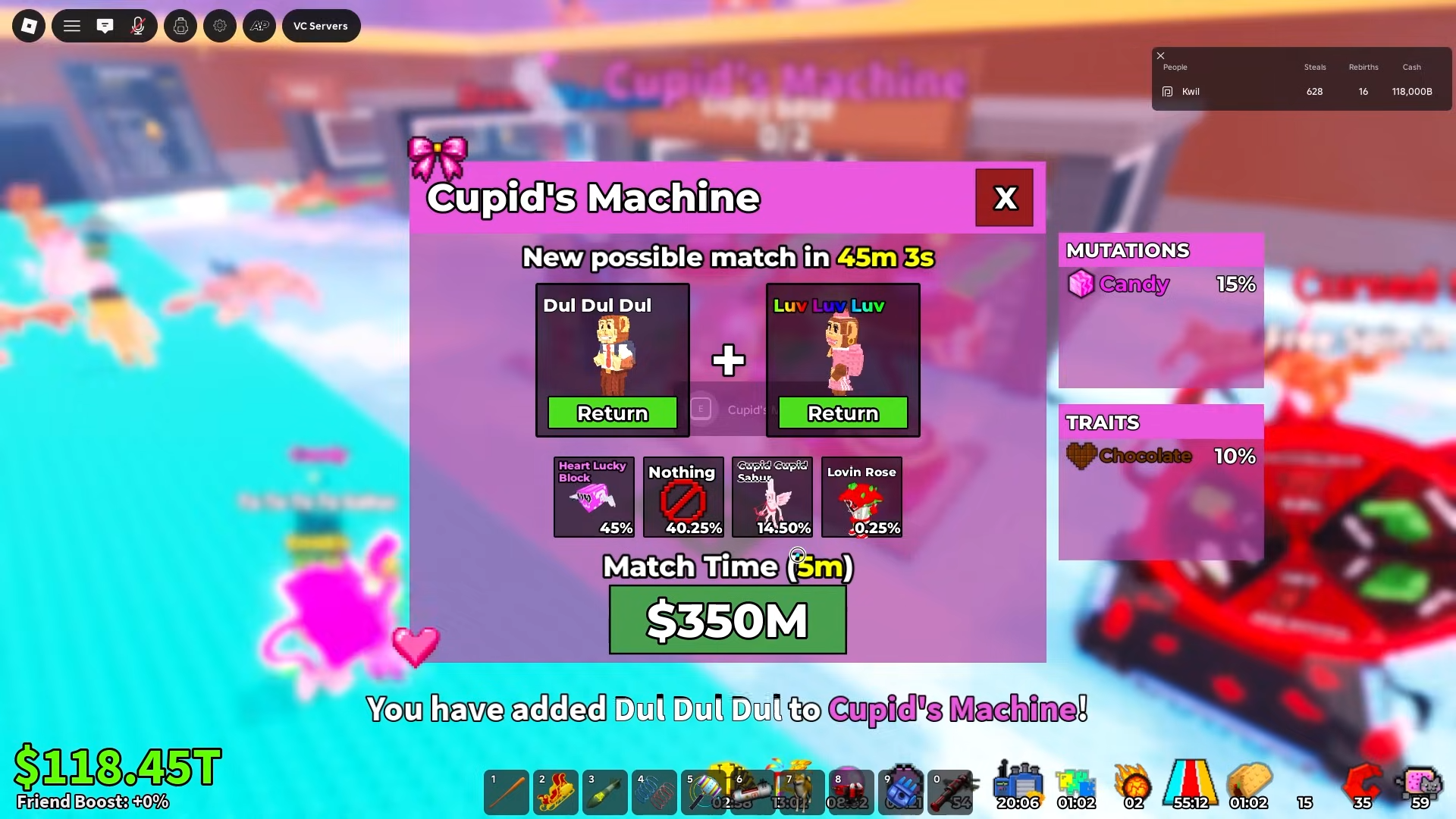 Cupid's Machine sits in the map's center between the Duels Machine and Cursed Spin. This fusion device accepts two specific Brainrots plus an in-game cash payment to generate Valentine's rewards.